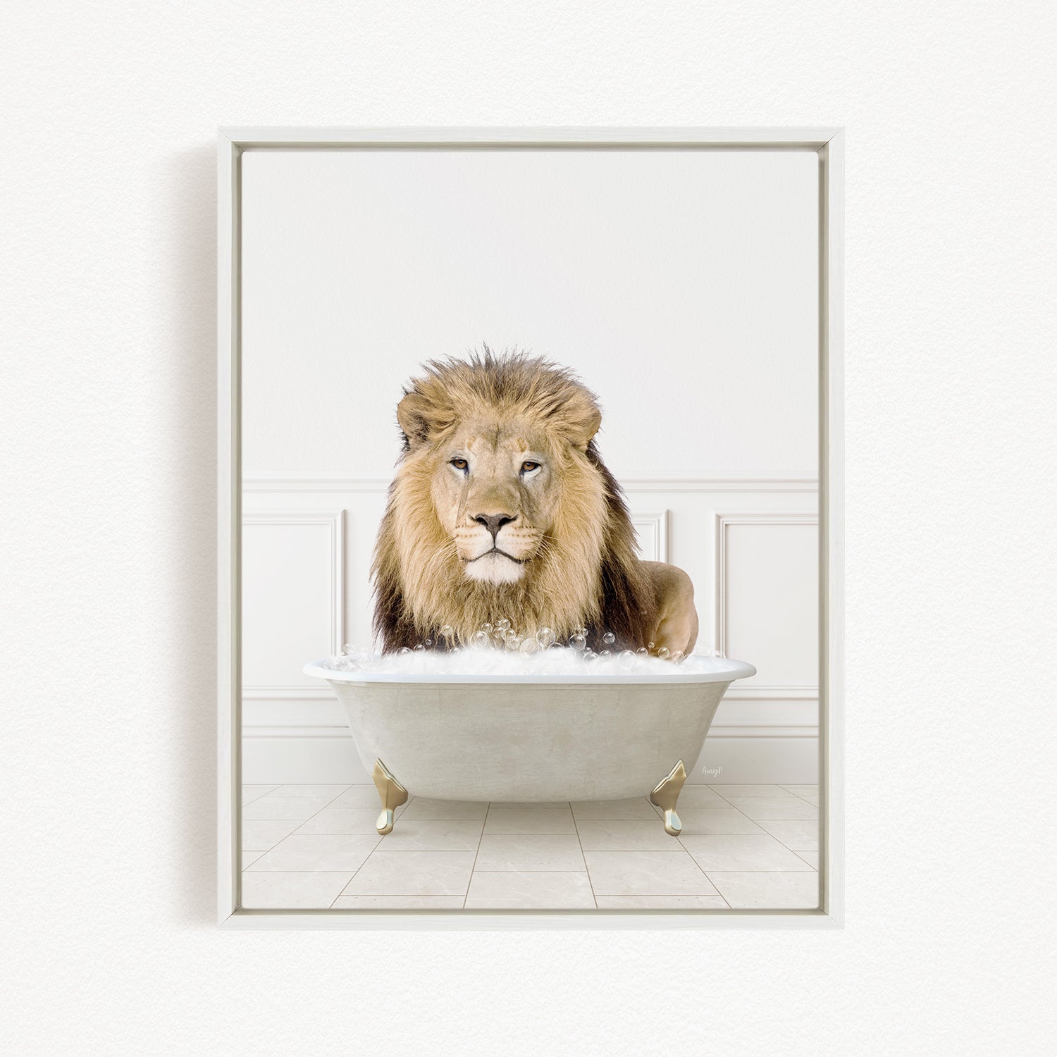 A lion sitting in a bathtub filled with water, surrounded by a white background.