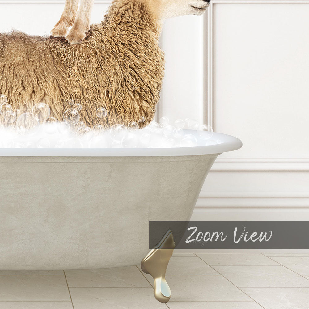 A fluffy brown sheep standing in a bathtub filled with water and bubbles, with a "Zoom View" label below the image.