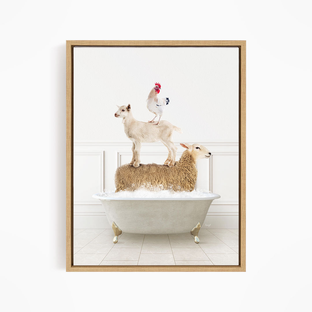 A framed image depicting a white goat standing on a sheep in a bathtub, with a rooster perched on top of the sheep.