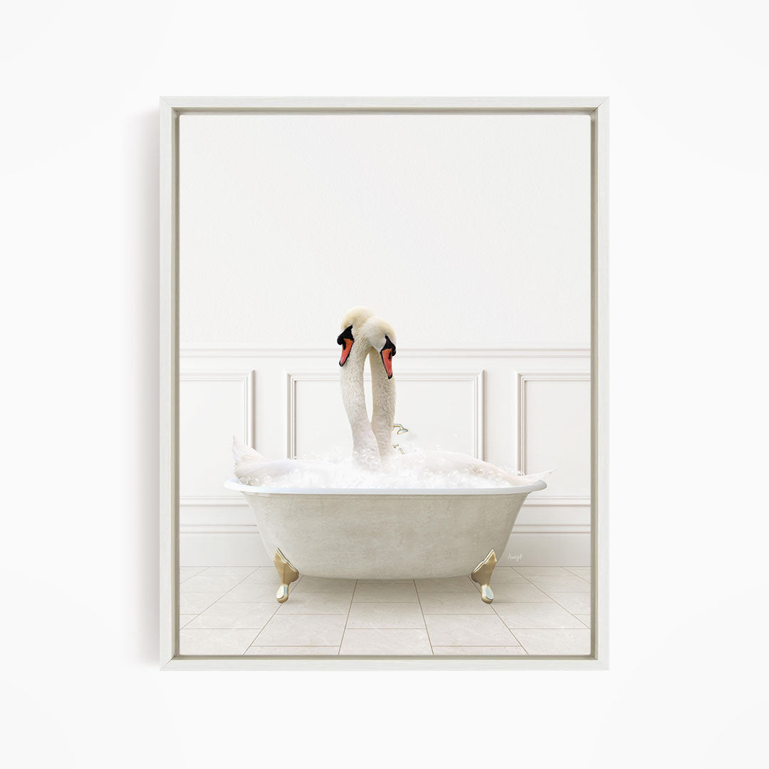 A pair of swans standing in a white bathtub filled with bubbles, creating a whimsical and playful scene.