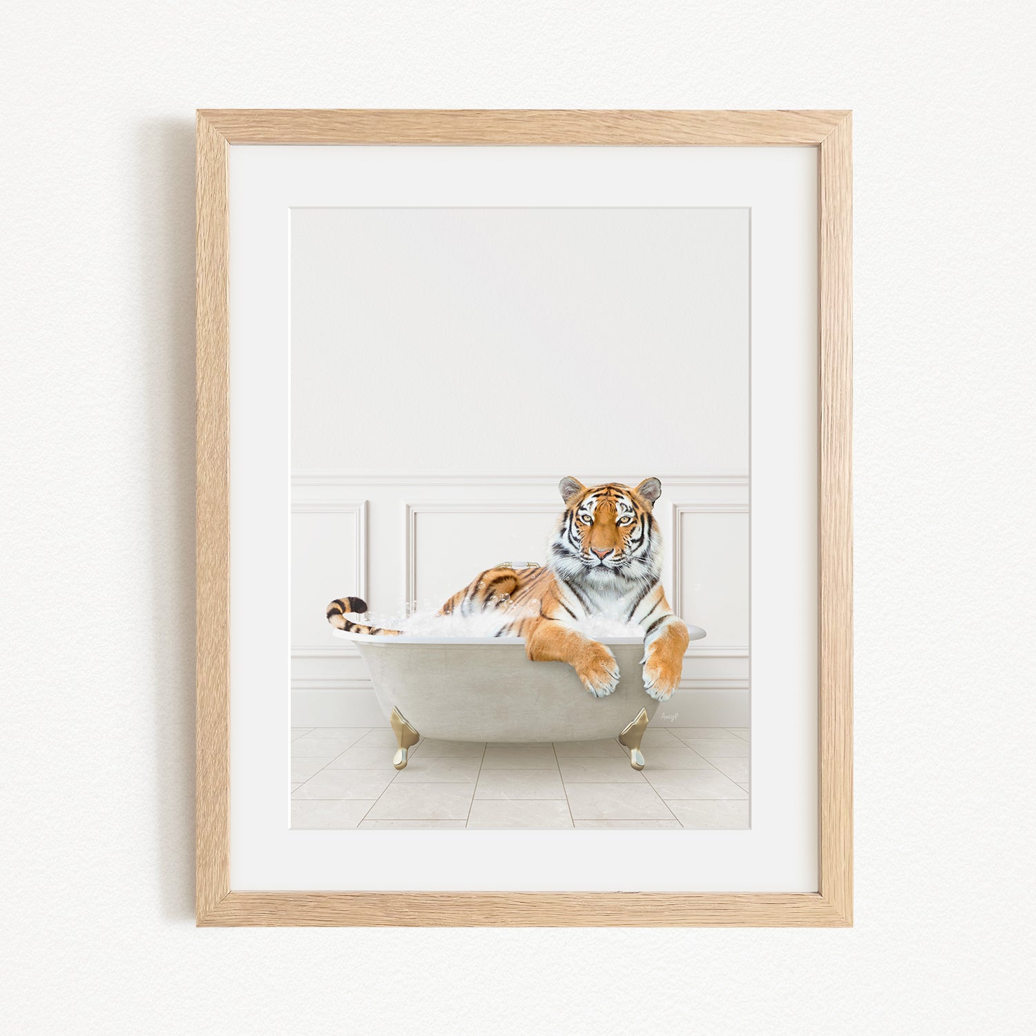 A tiger is sitting in a white bathtub, appearing relaxed and comfortable.