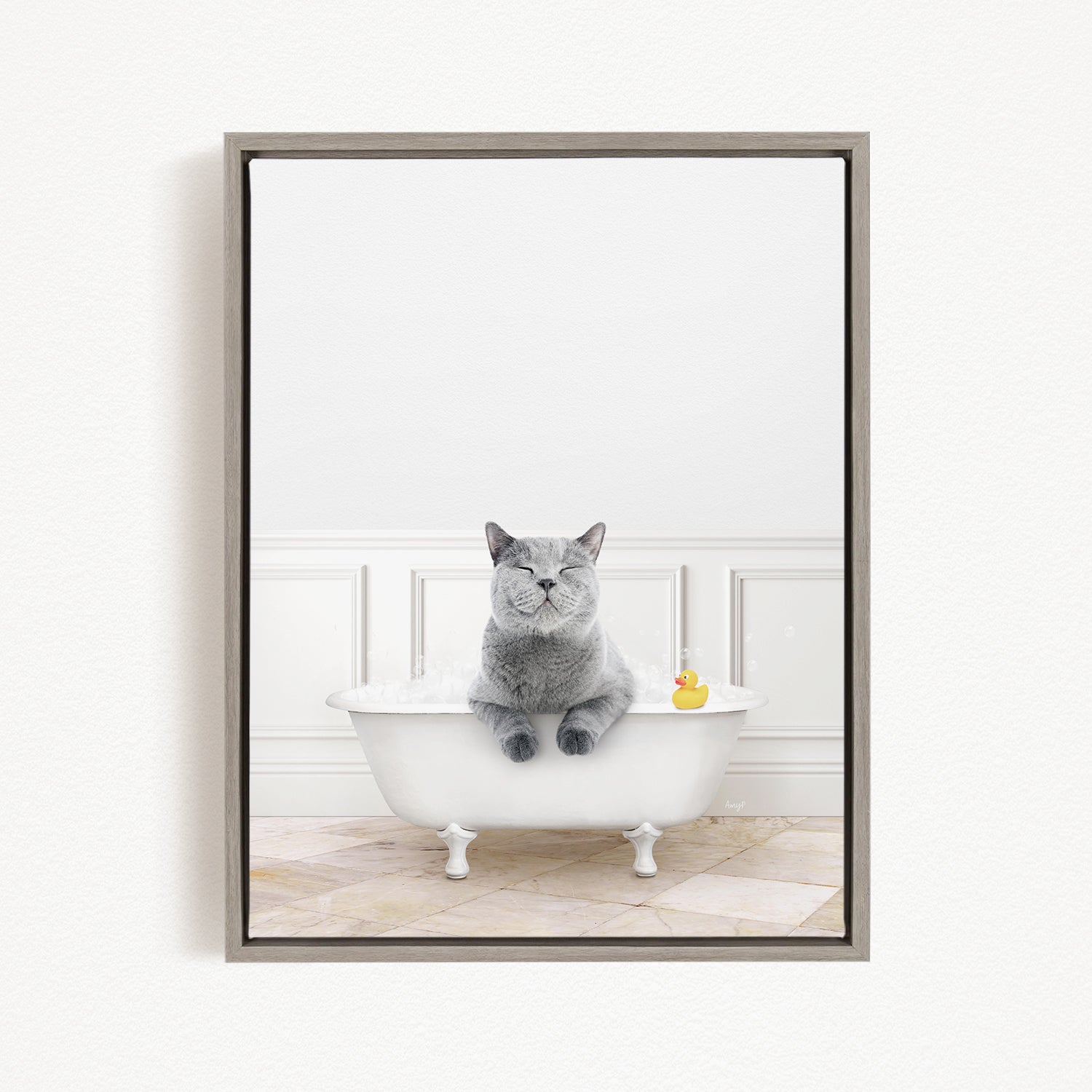 A gray cat sitting in a white bathtub, with a yellow rubber duck floating in the water.