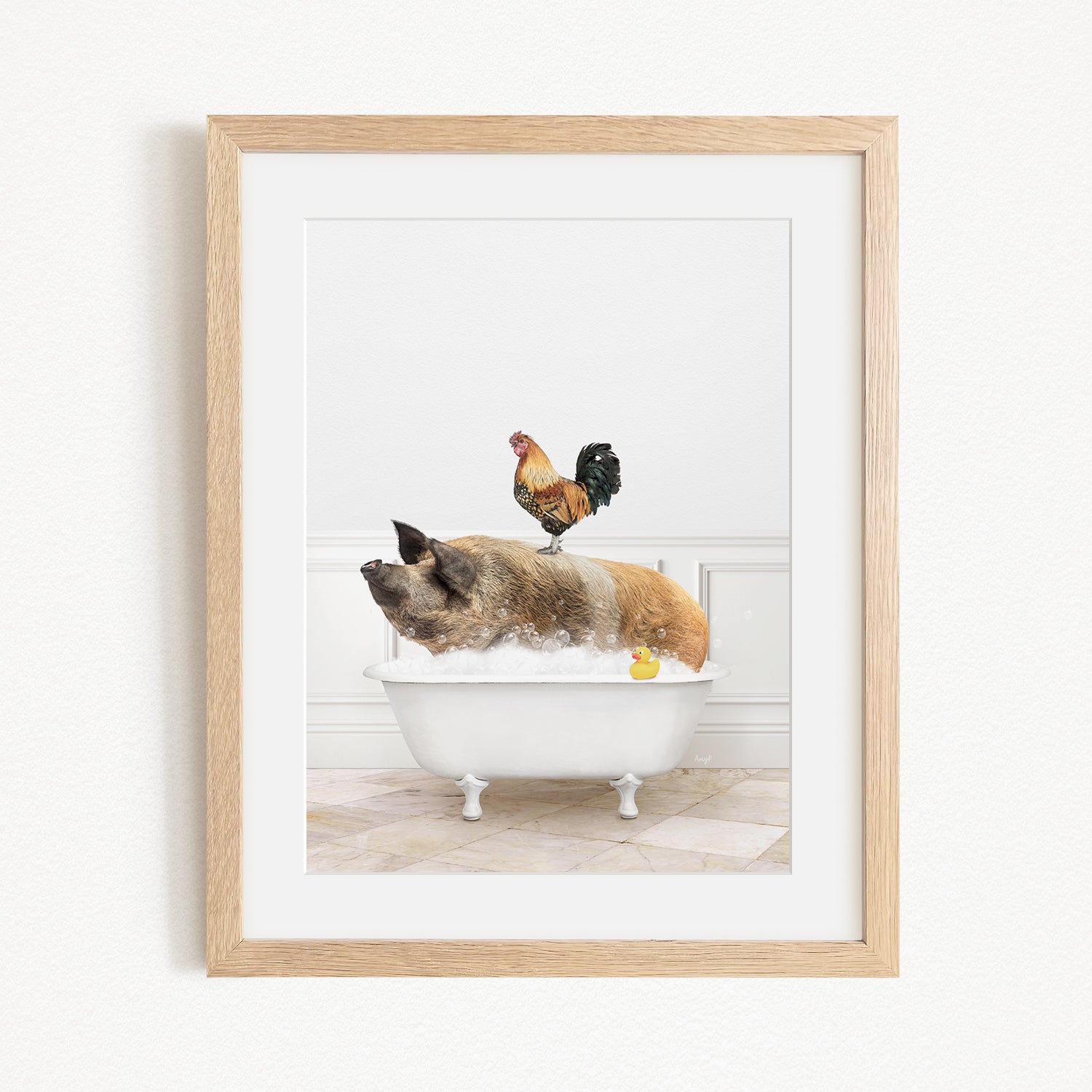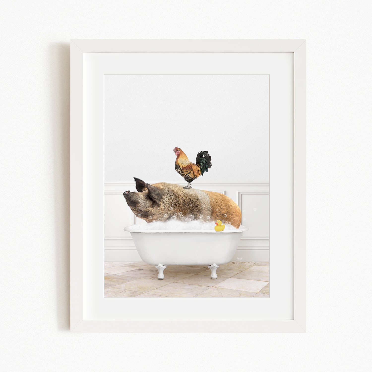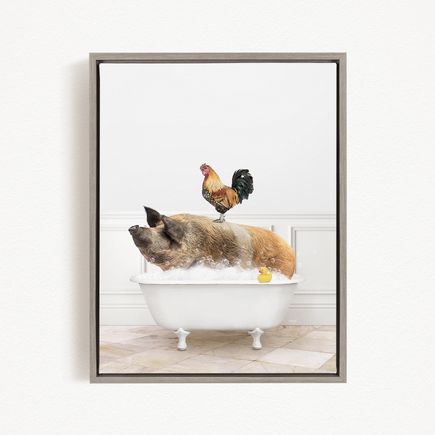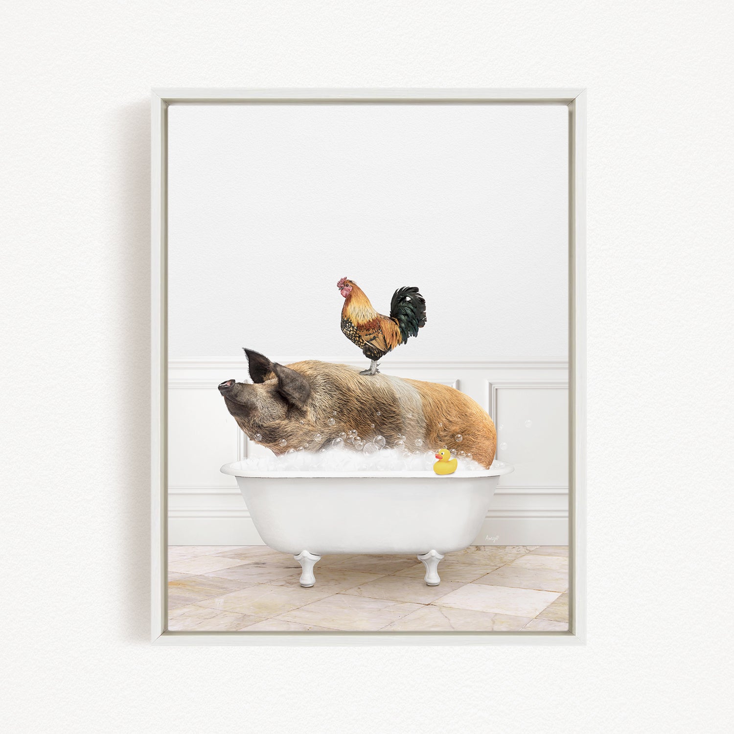 A rooster sits atop a pig in a bathtub, with a yellow rubber duck floating in the water.