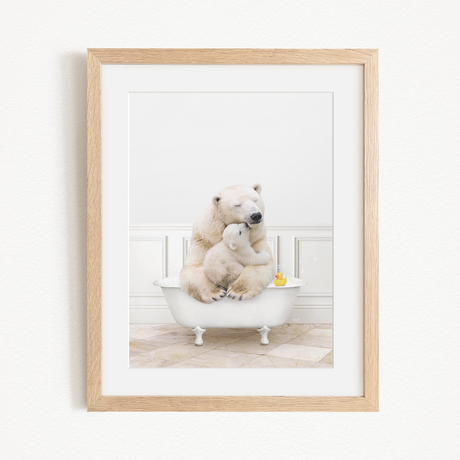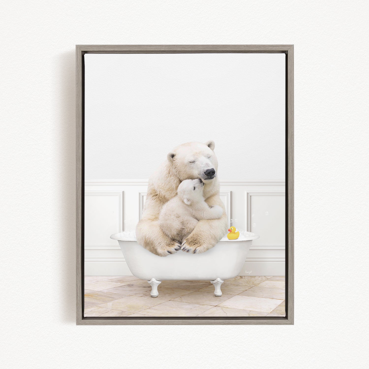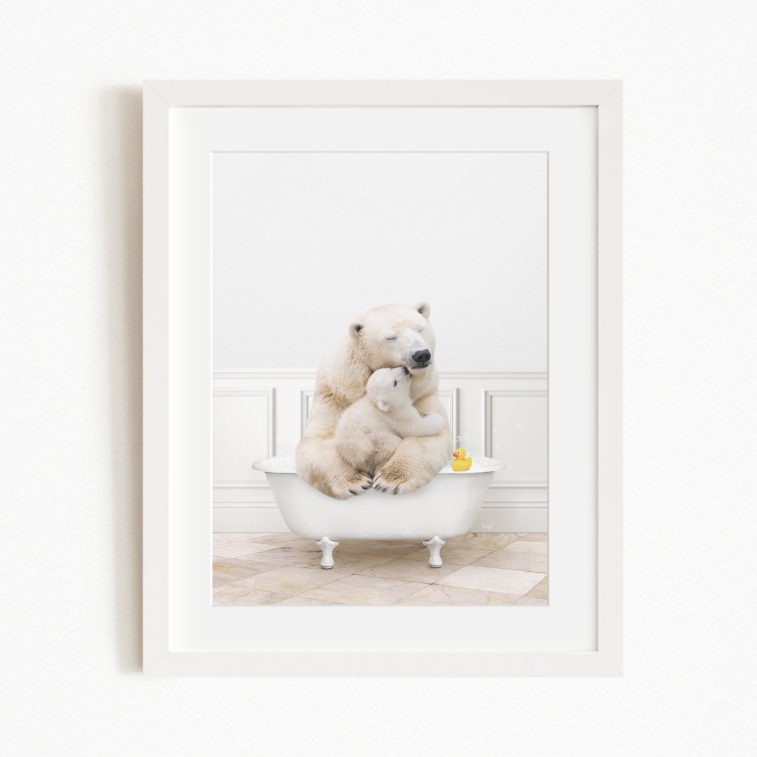 A mother polar bear and her cub cuddling in a bathtub, with a rubber duck floating nearby.