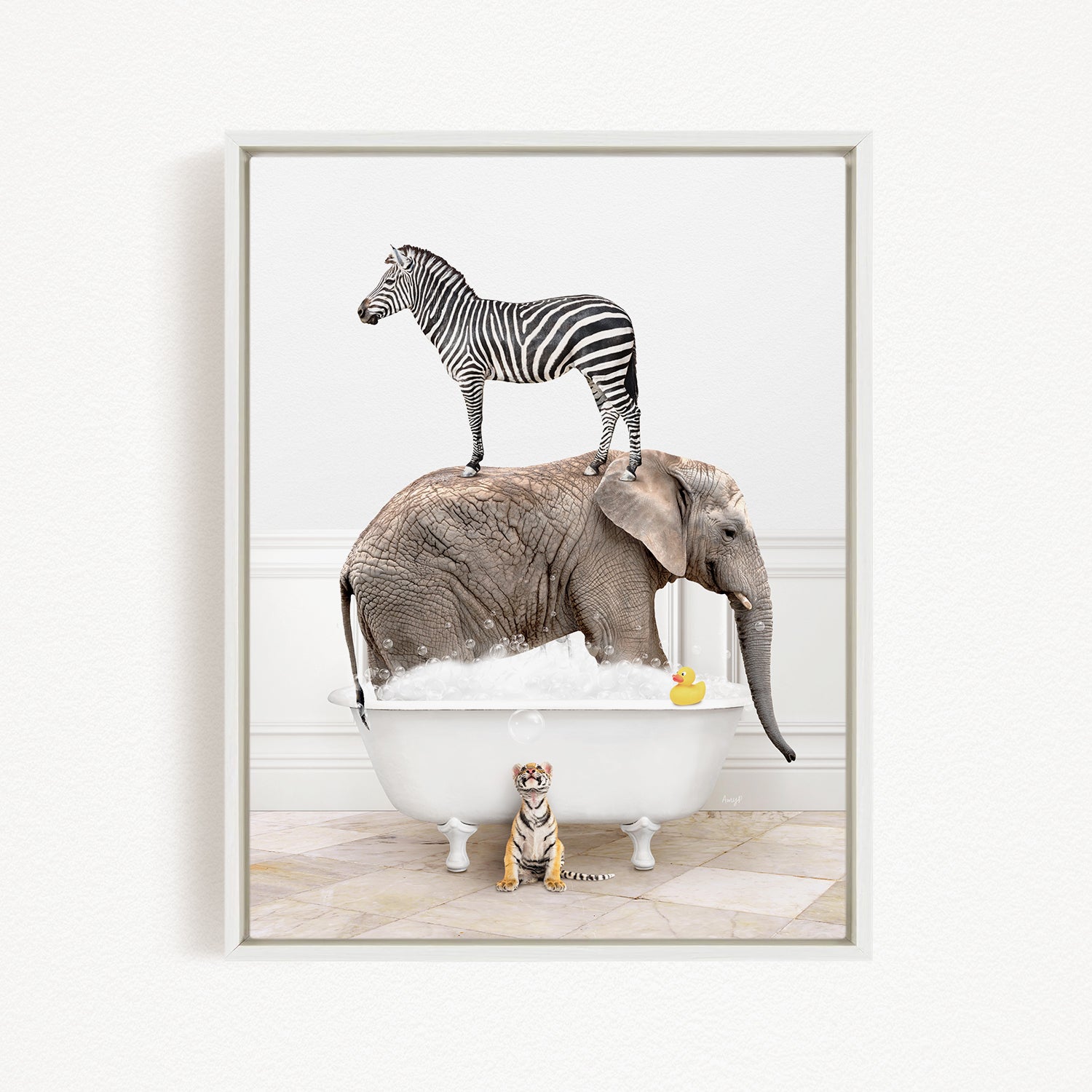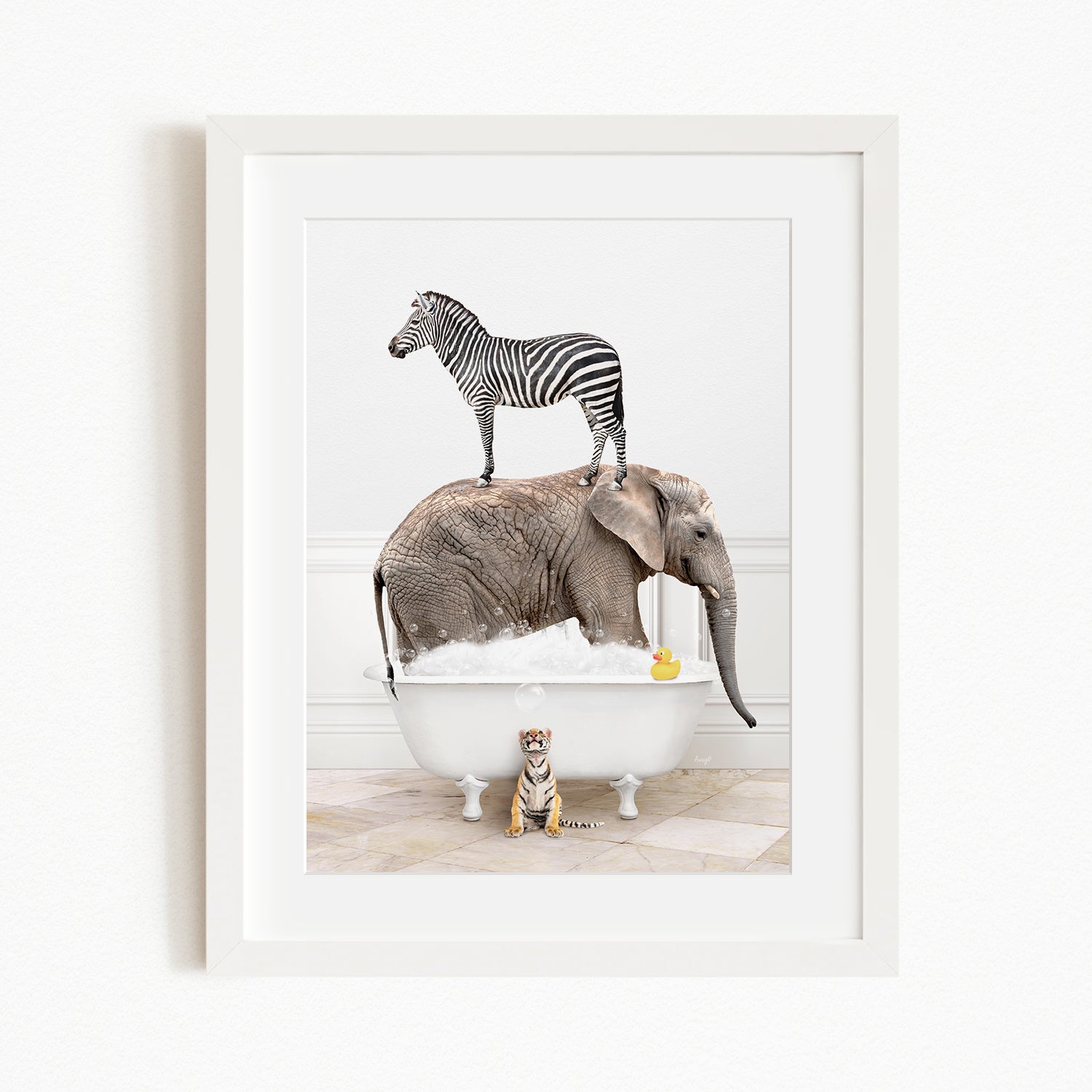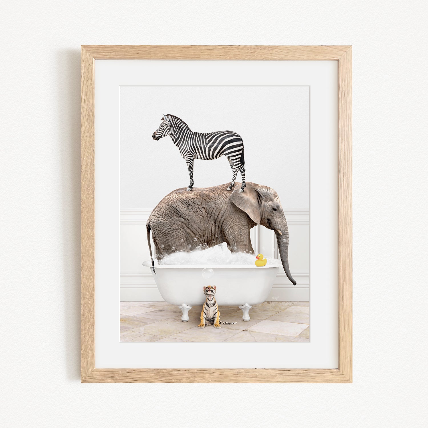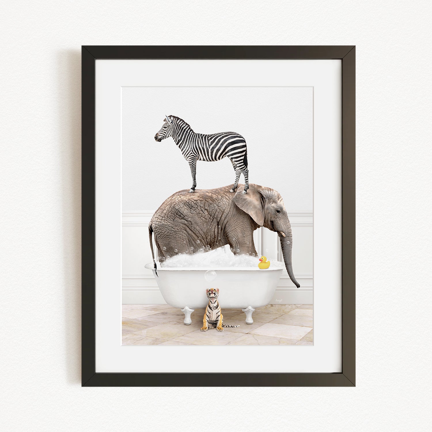 A zebra stands on an elephant's back while the elephant is submerged in a bathtub, with a small tiger sitting on the edge of the tub.