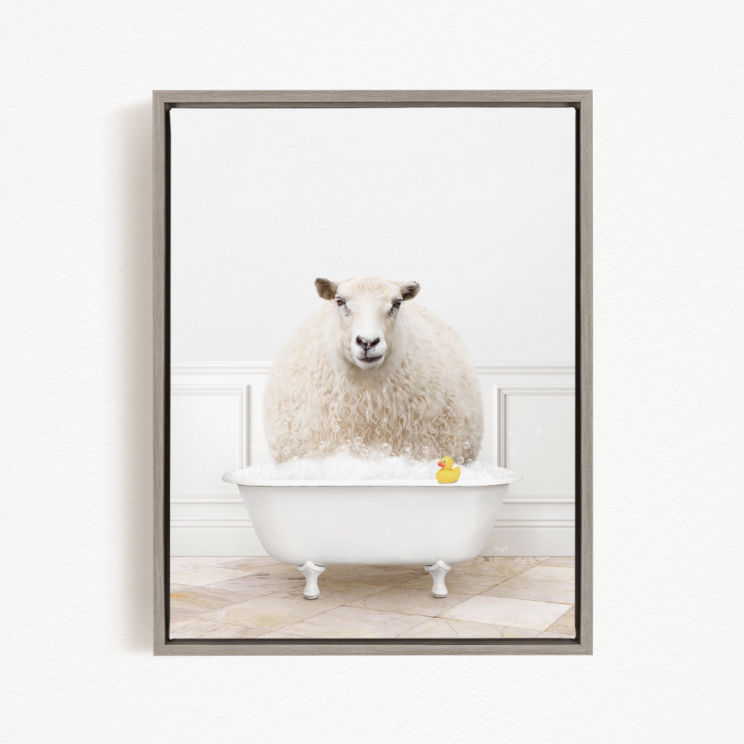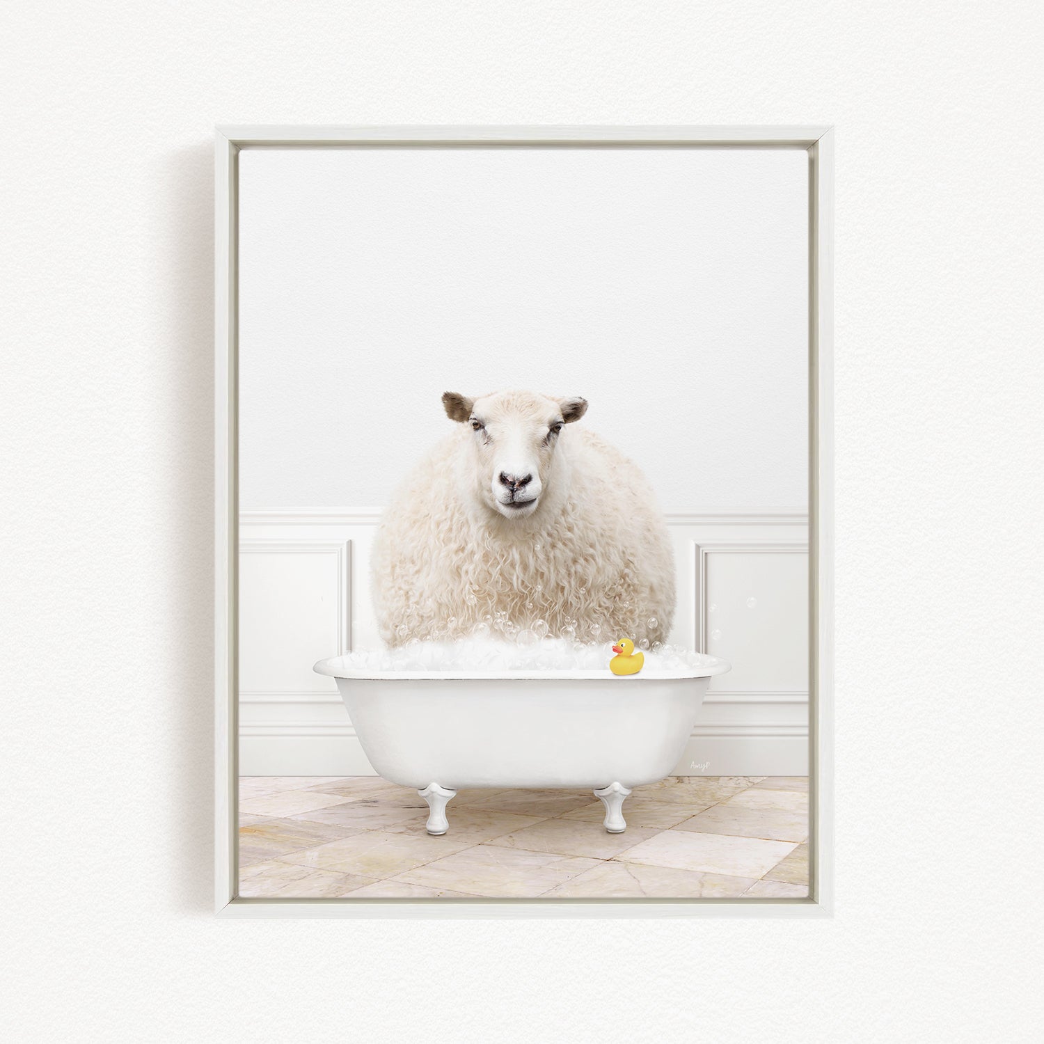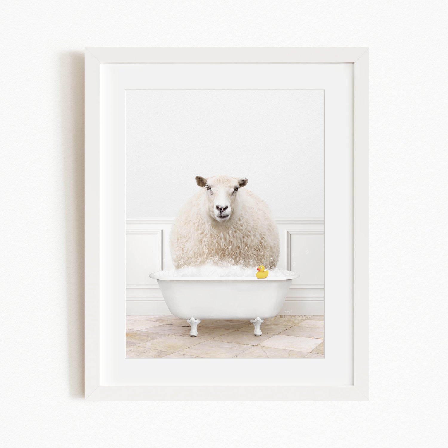 A fluffy white sheep sits in a white bathtub, with a yellow rubber duck floating on the water.