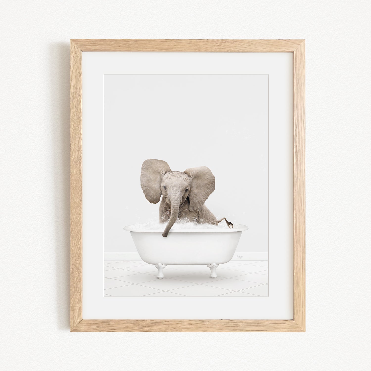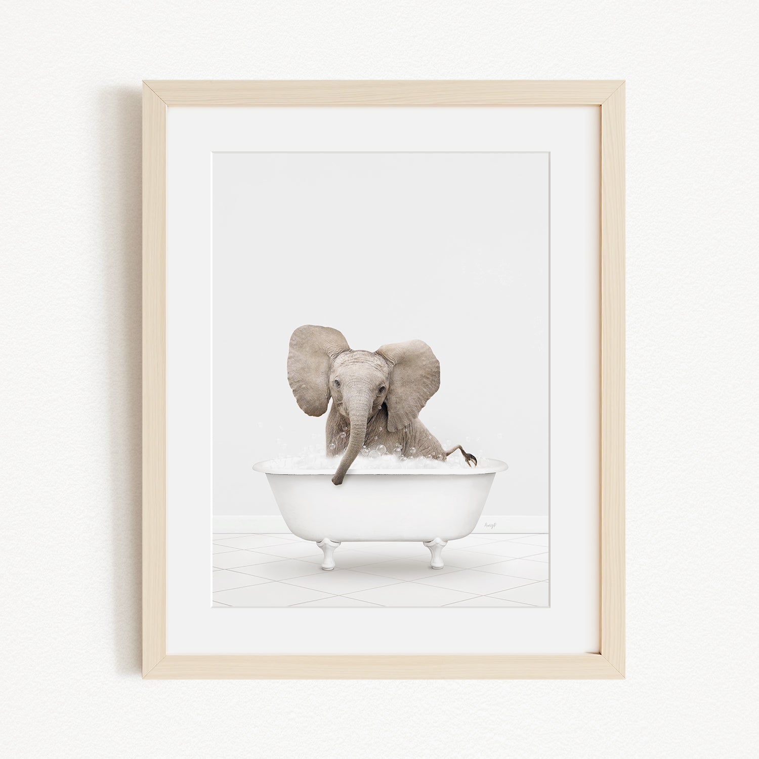 A baby elephant sitting in a bathtub filled with water, surrounded by a white background.