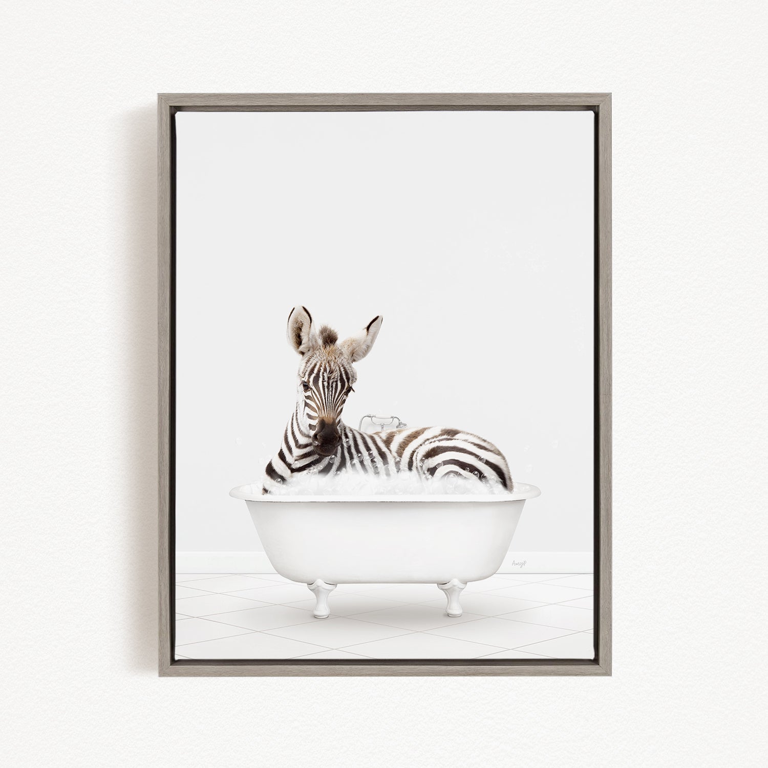 A zebra is sitting in a white bathtub, surrounded by a white background.