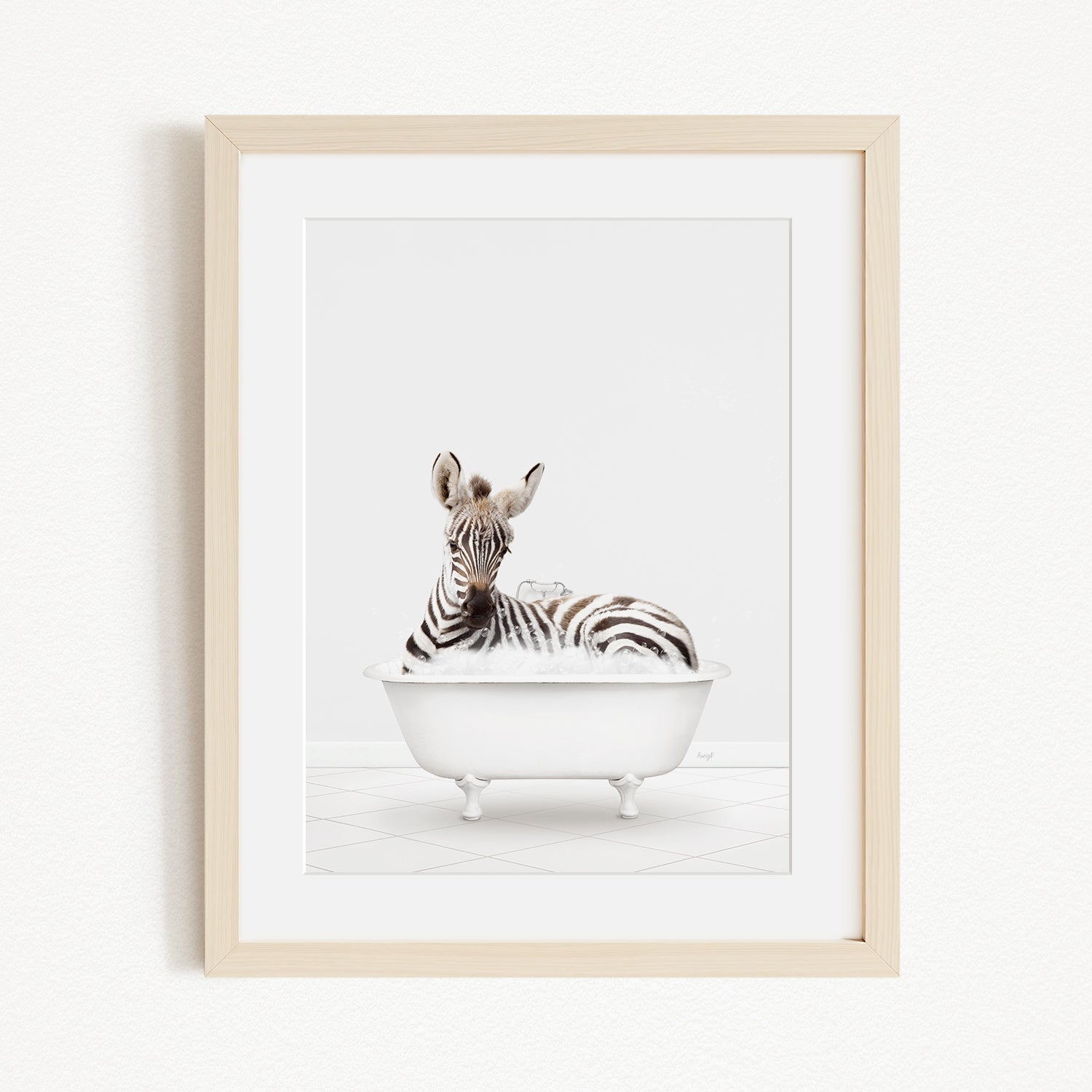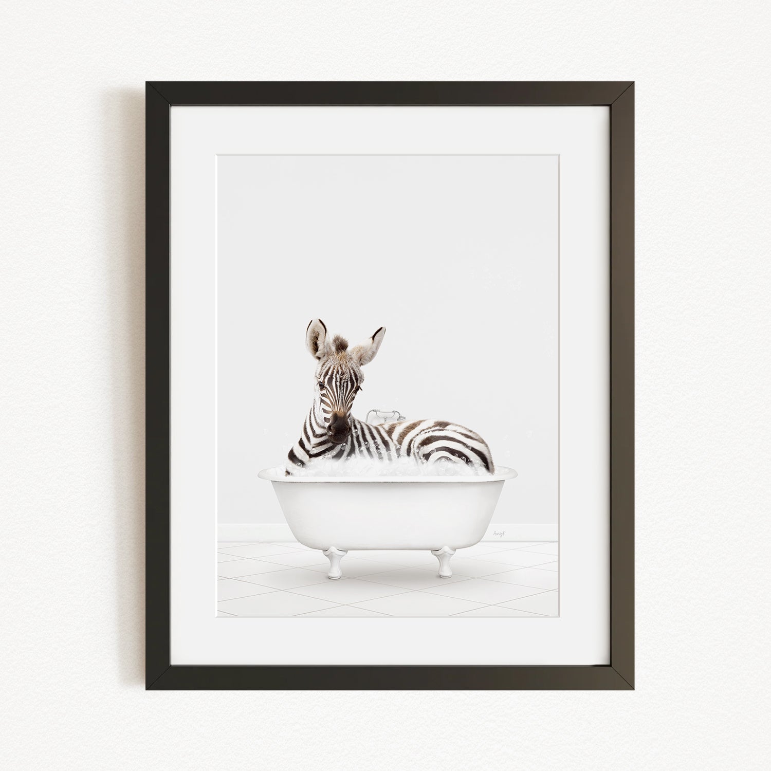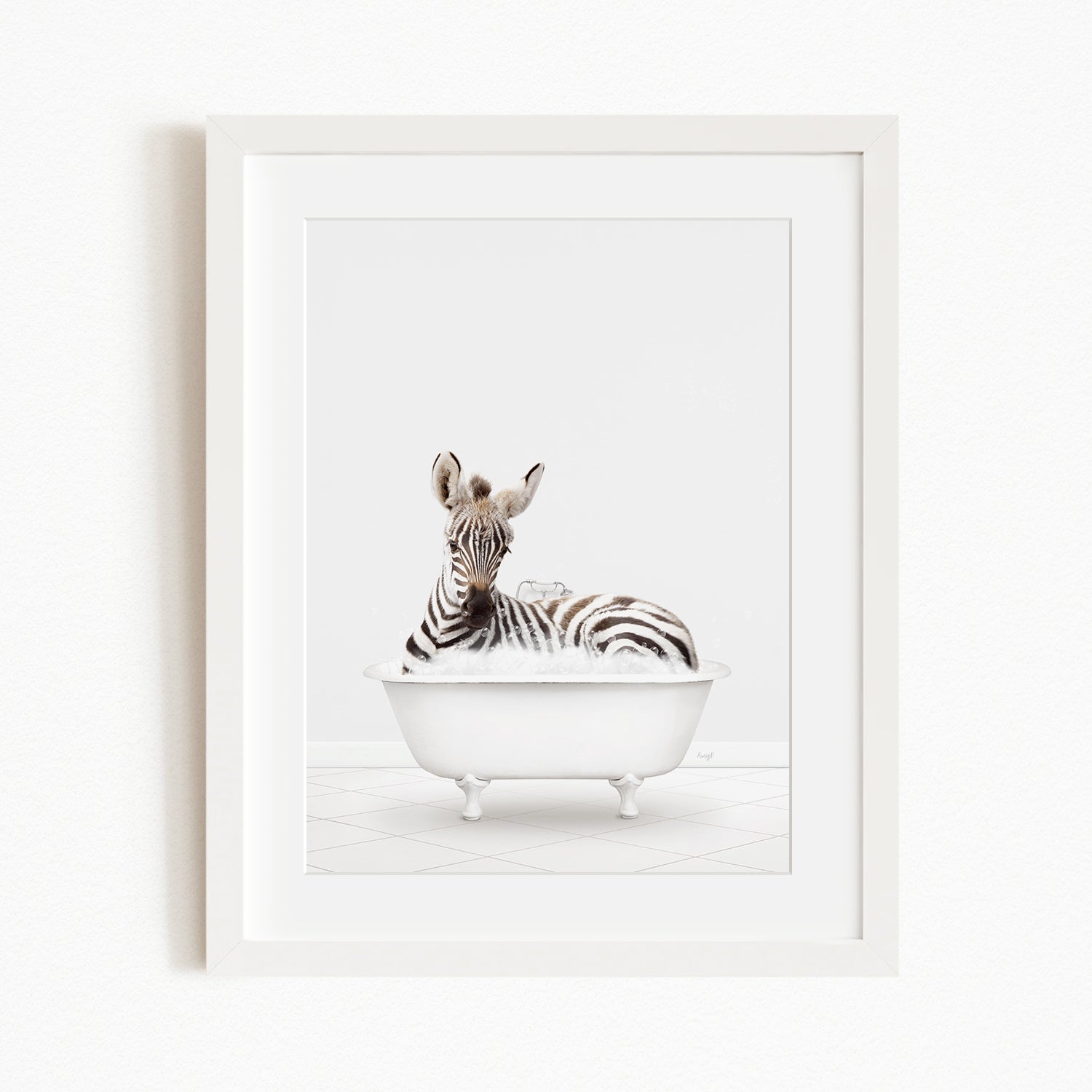 A zebra is sitting in a white bathtub filled with bubbles, creating a whimsical and playful scene.