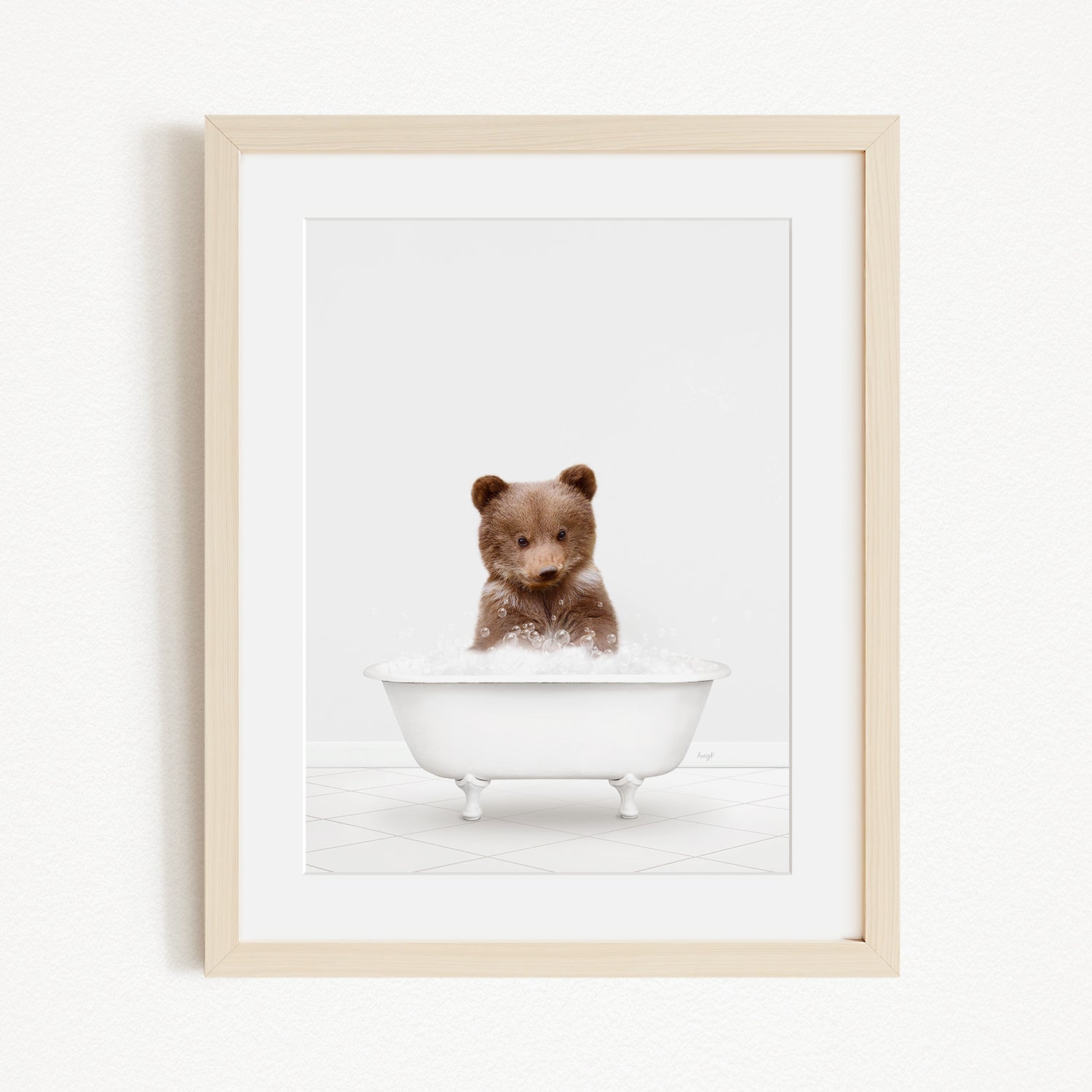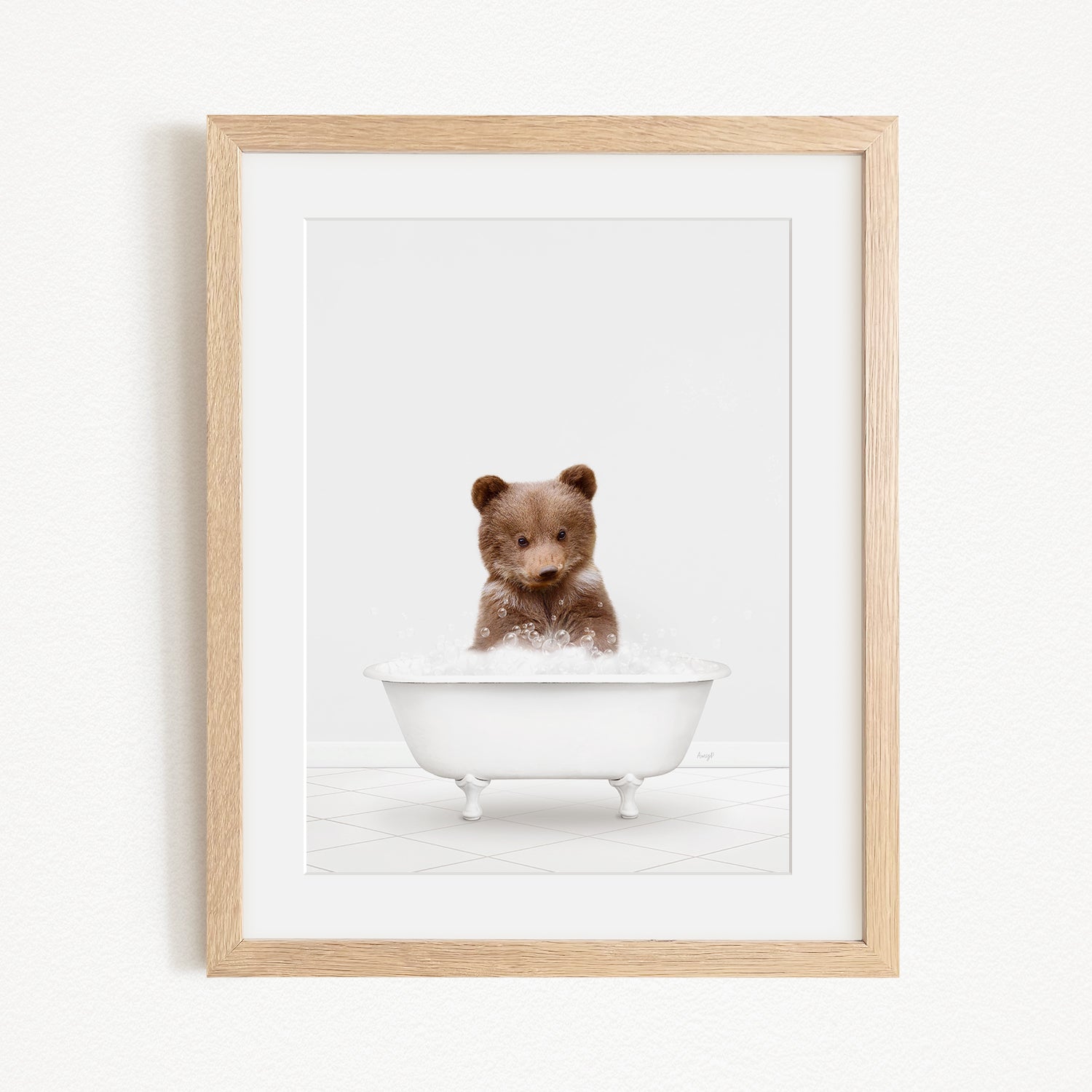 A cute brown bear sitting in a white bathtub filled with bubbles, as depicted in the framed image.