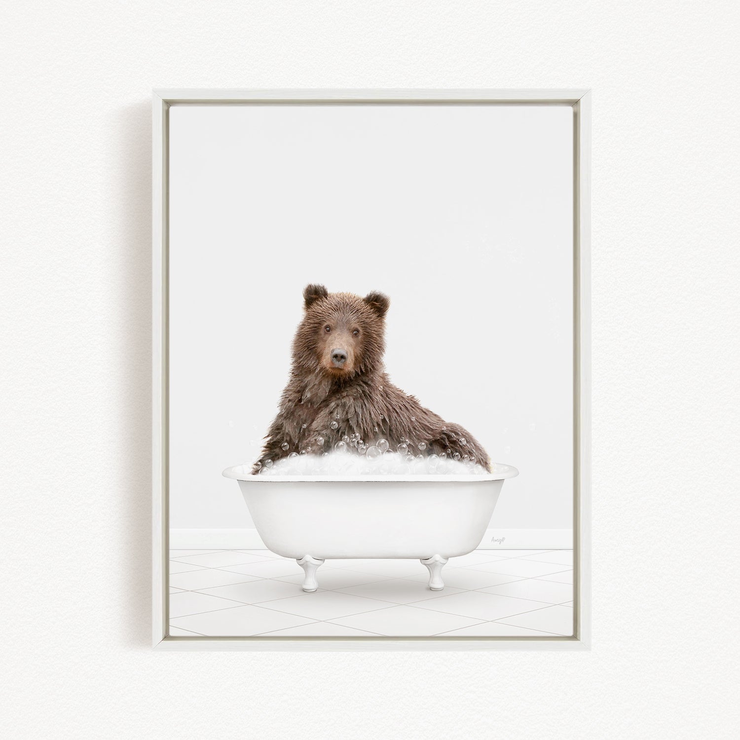 A brown bear sitting in a white bathtub filled with bubbles, looking directly at the camera.