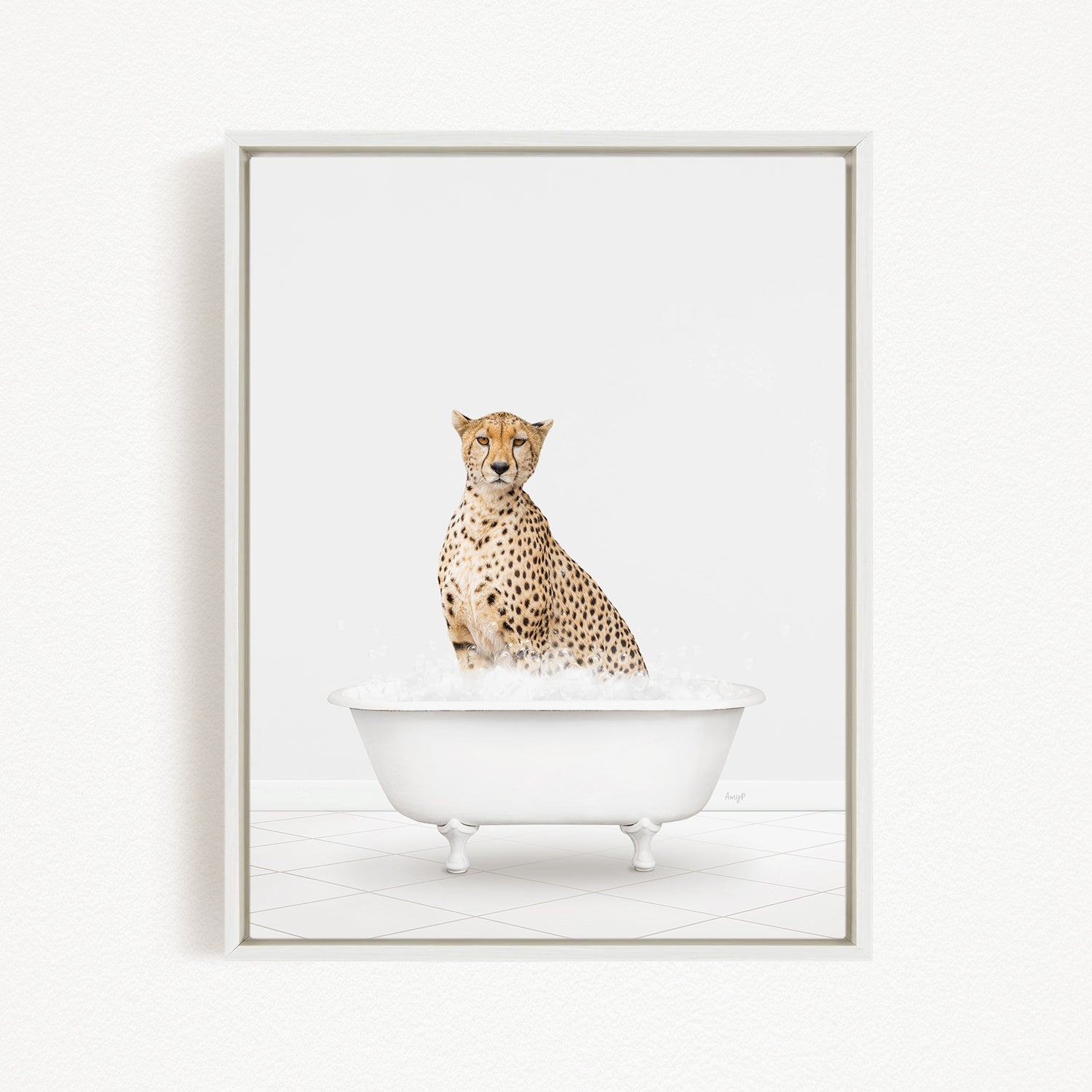 A cheetah sitting in a white bathtub filled with water, creating a playful and whimsical scene.