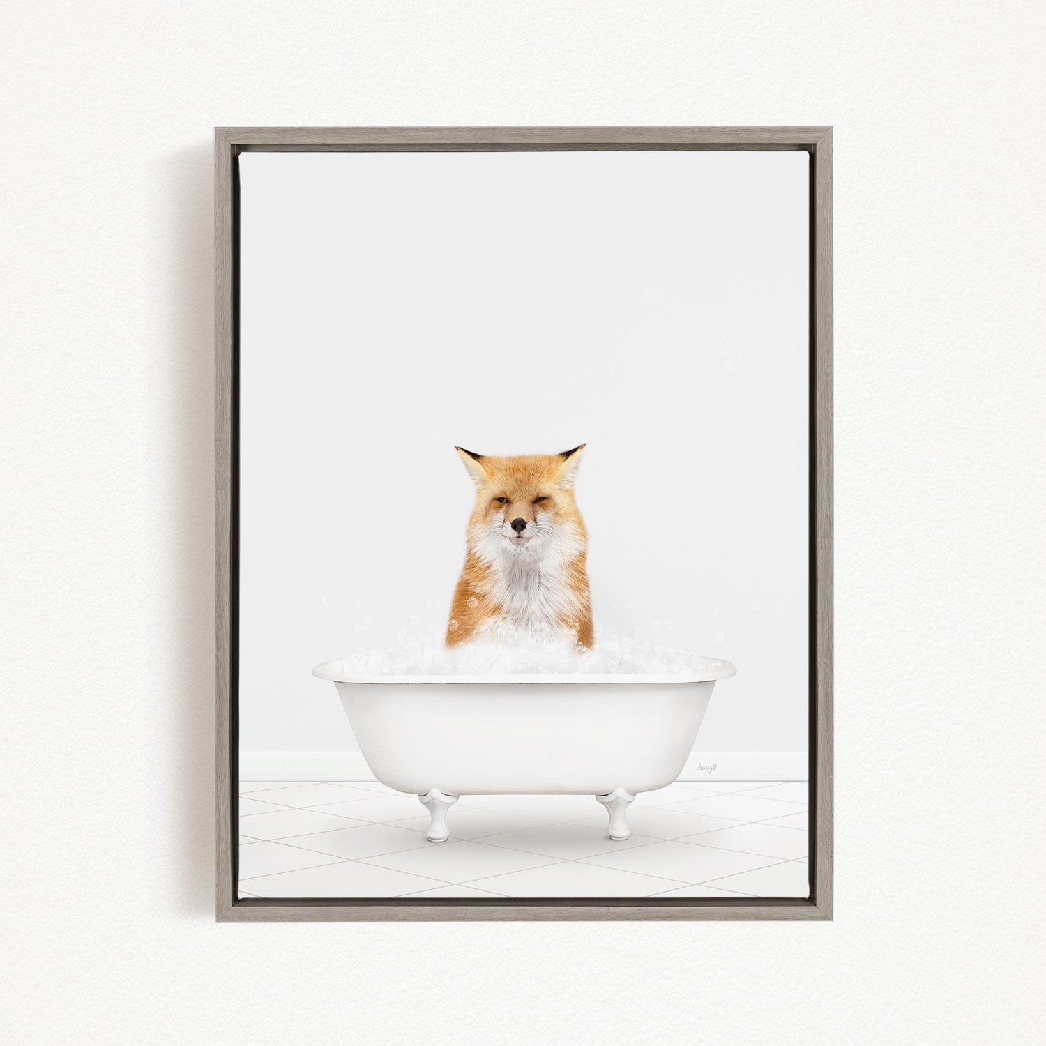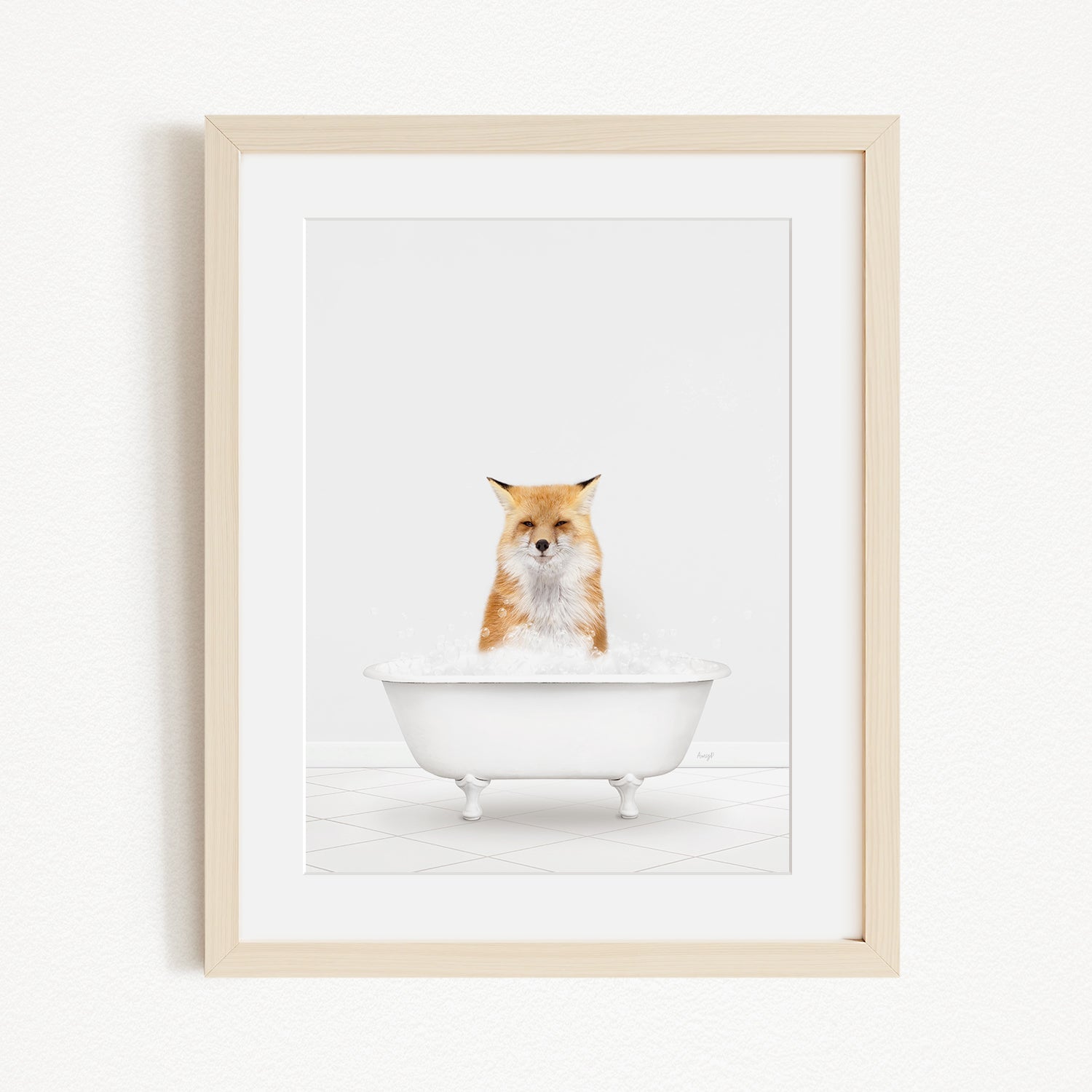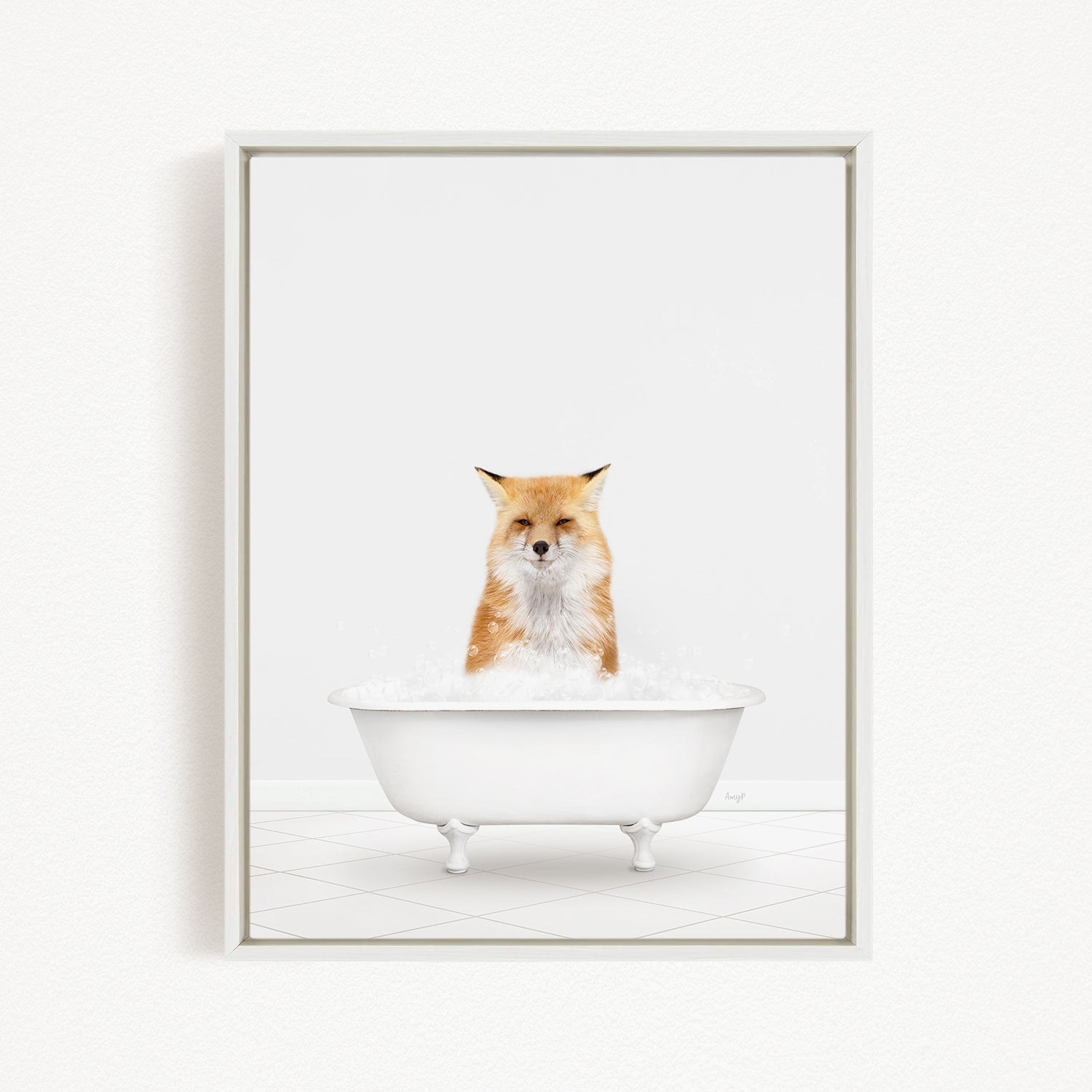 A framed image of a fox sitting in a white bathtub filled with bubbles.