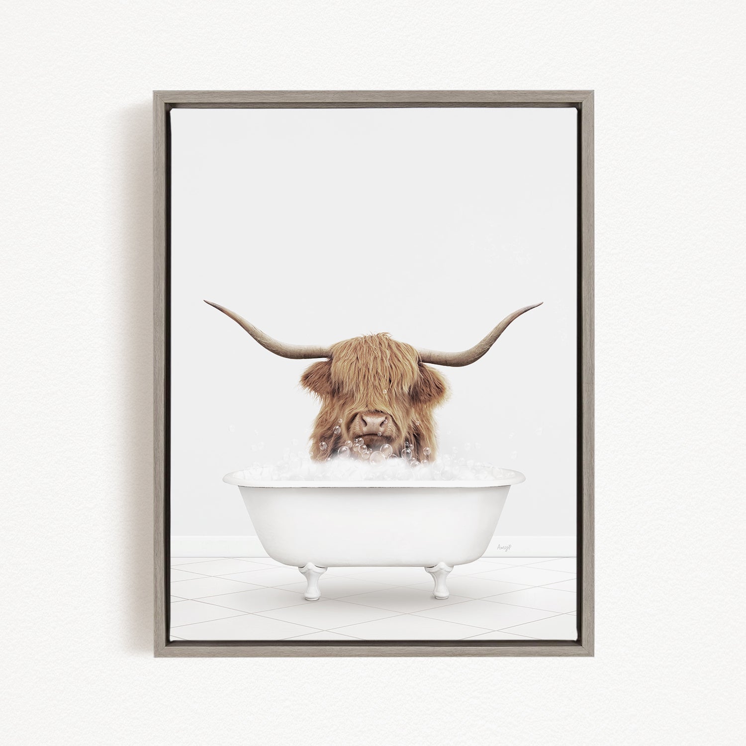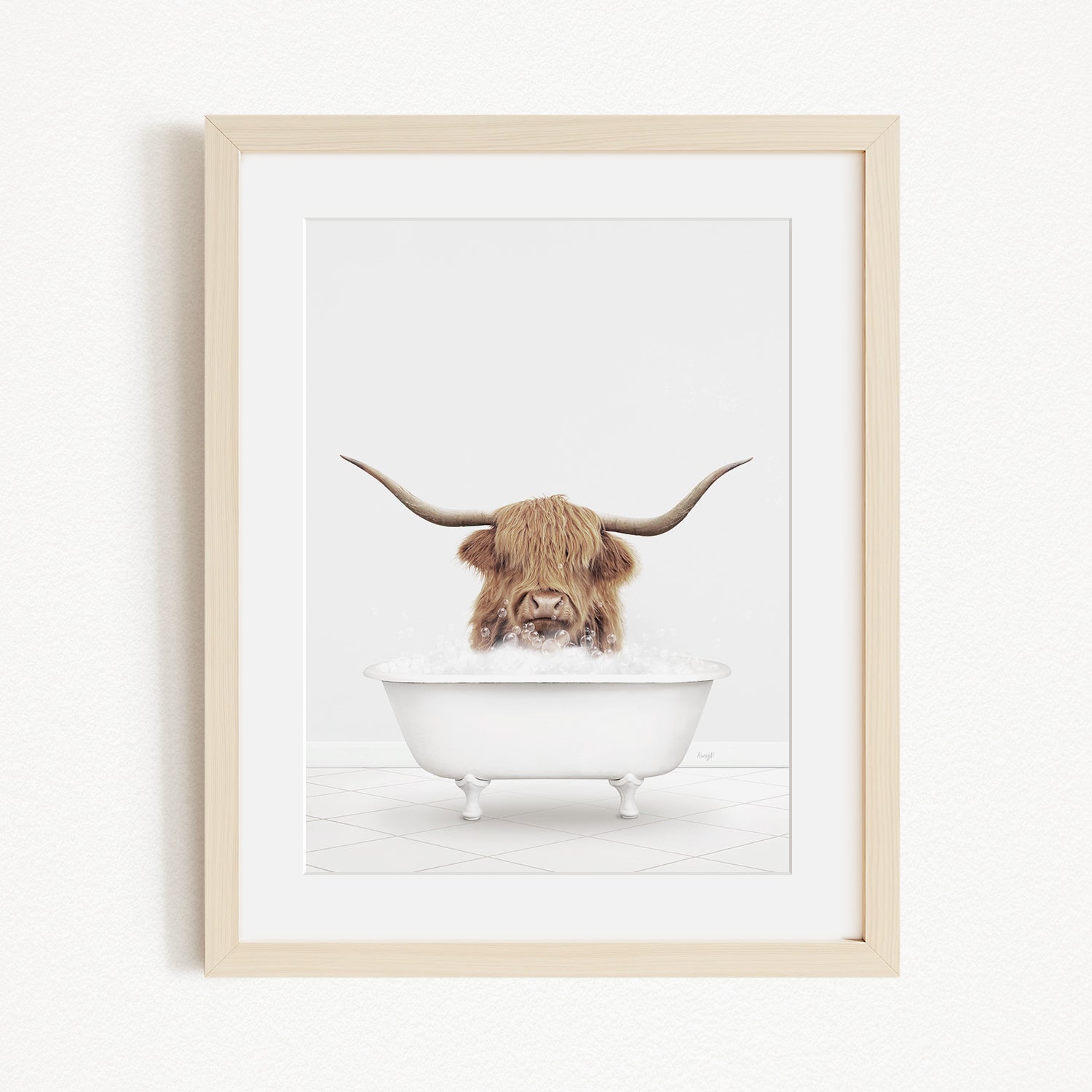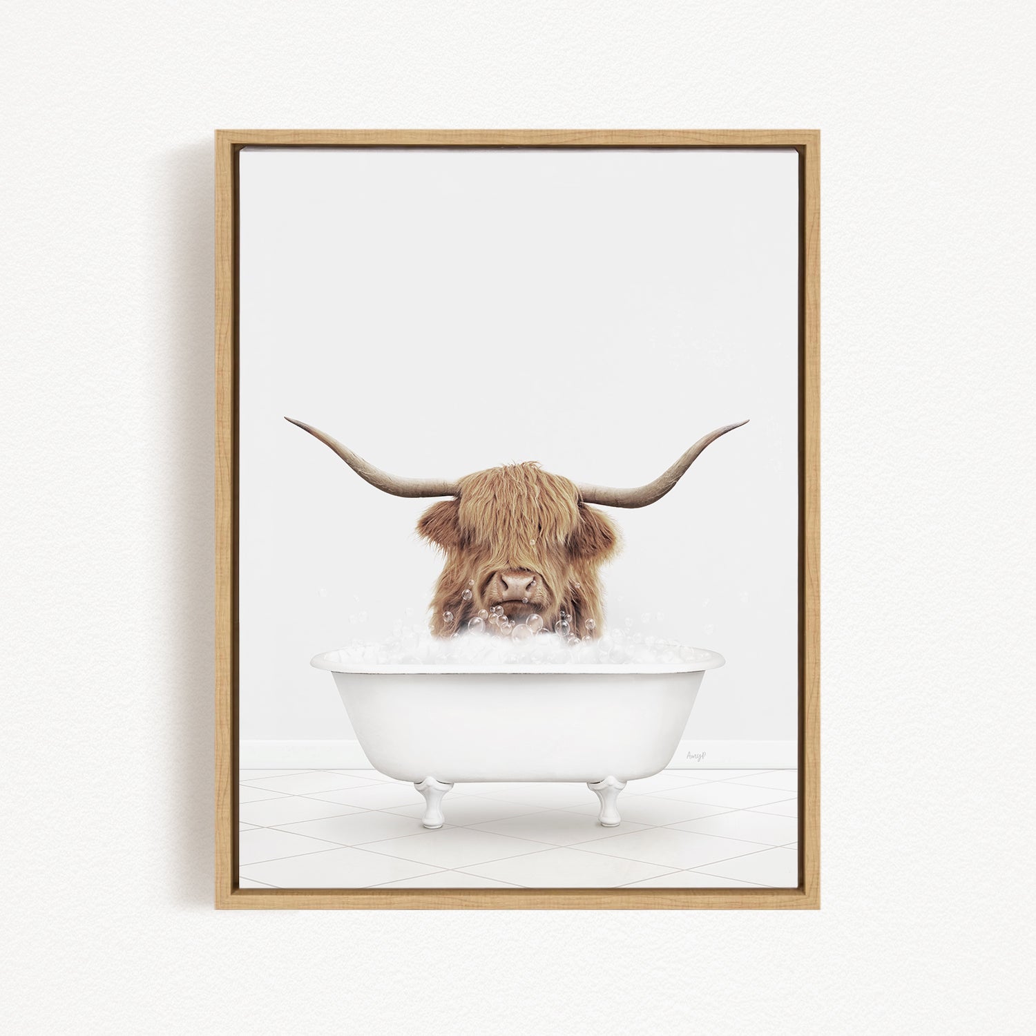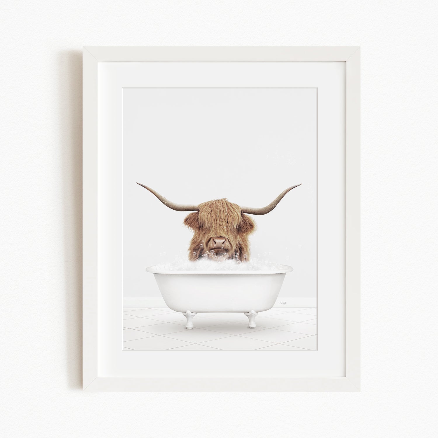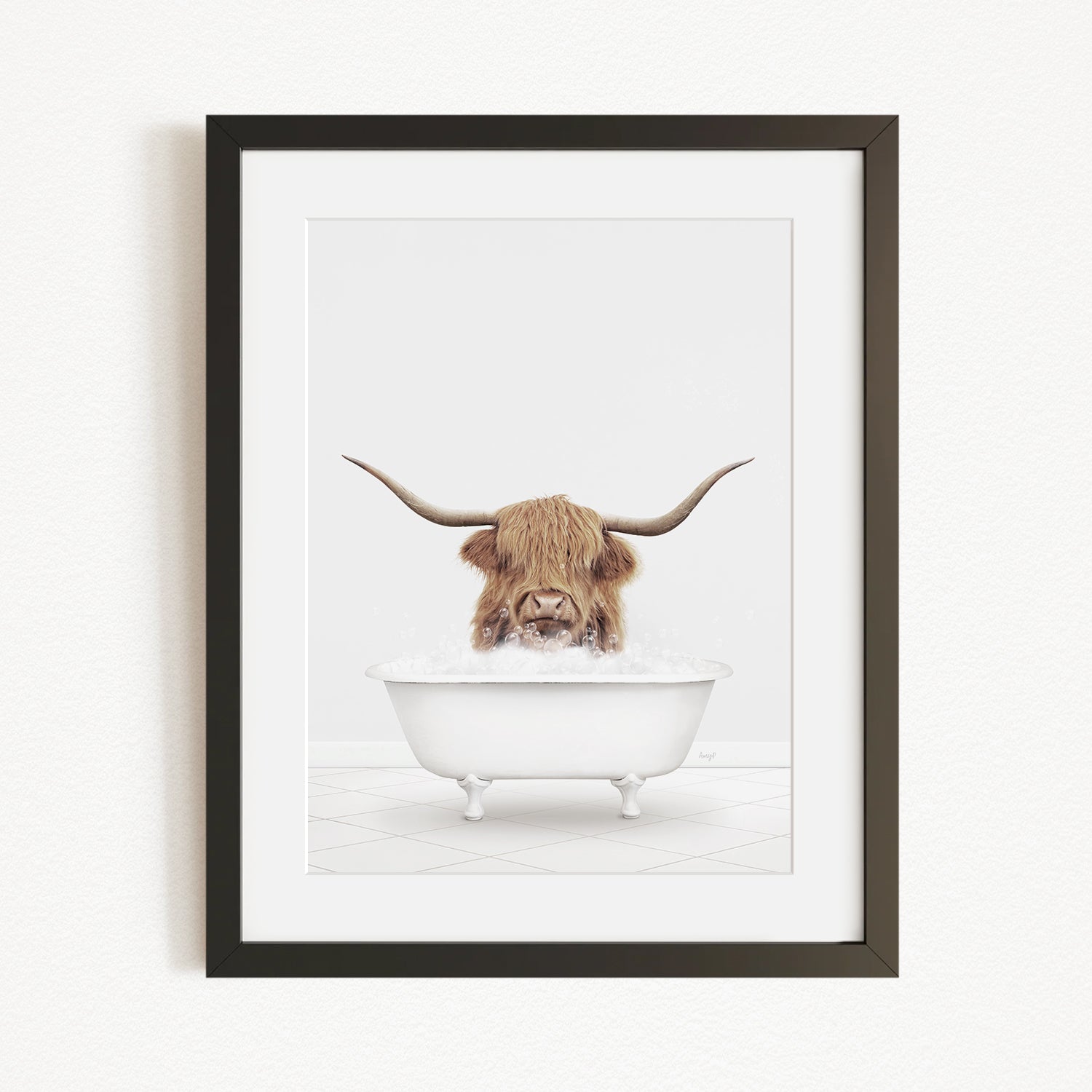 A framed image depicting a Highland cow with long horns sitting in a white bathtub filled with water.