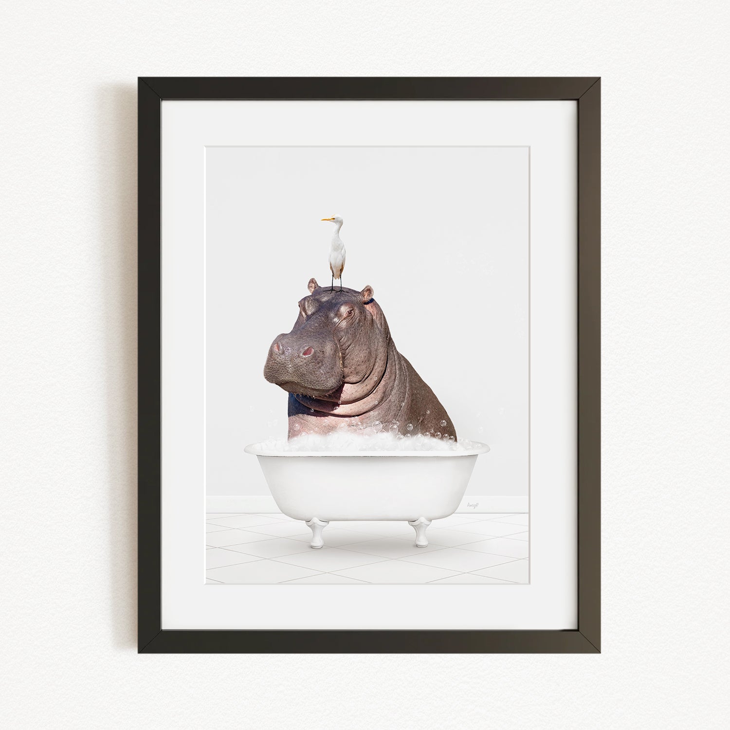 A framed image depicting a large hippopotamus sitting in a bathtub, with a seagull perched on its head.