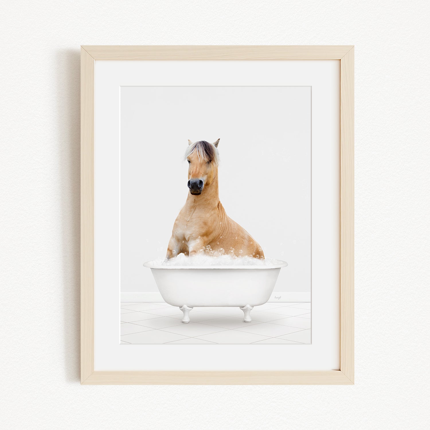 A light brown horse is sitting in a white bathtub filled with water, creating a whimsical and playful scene.