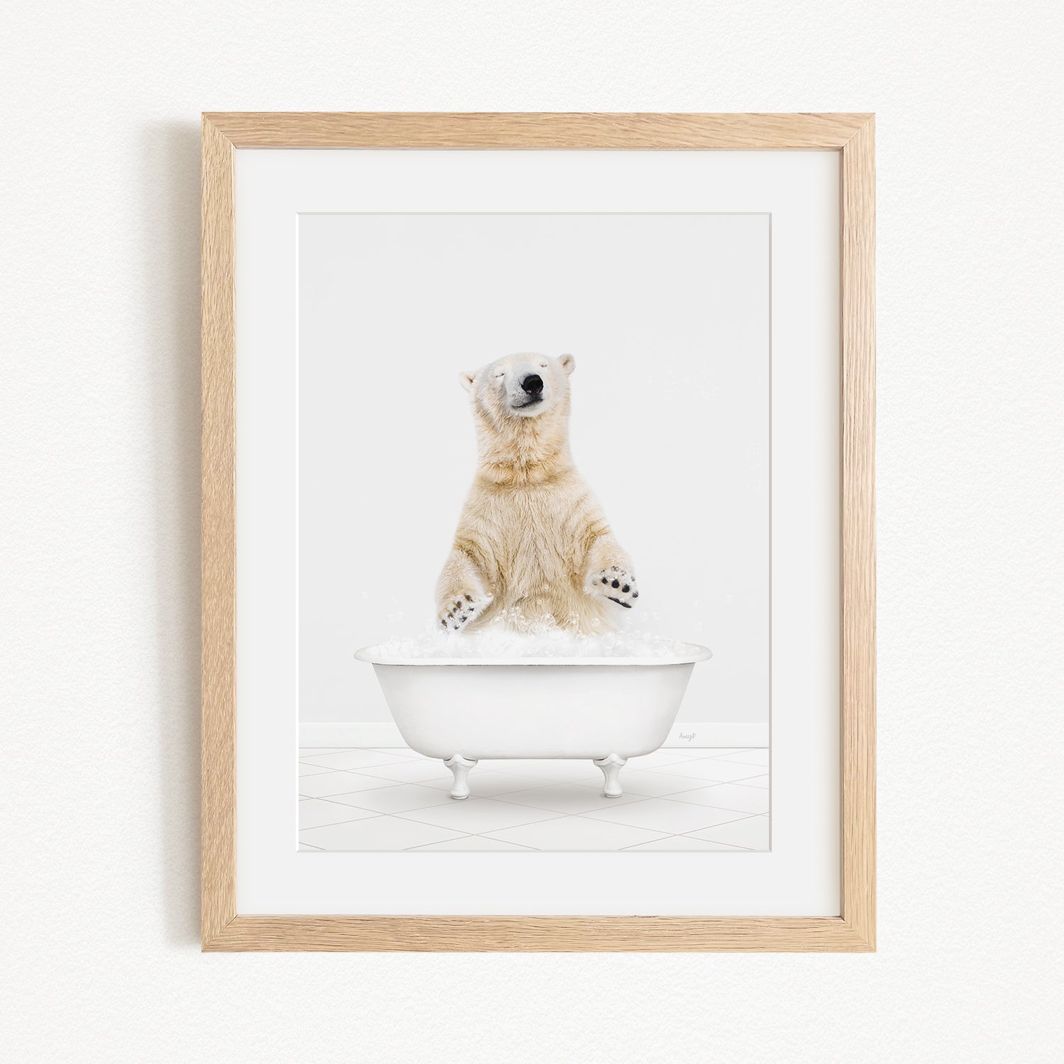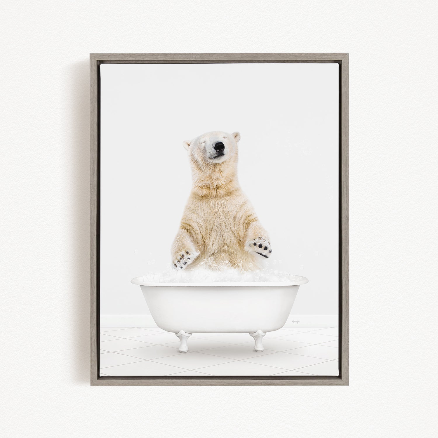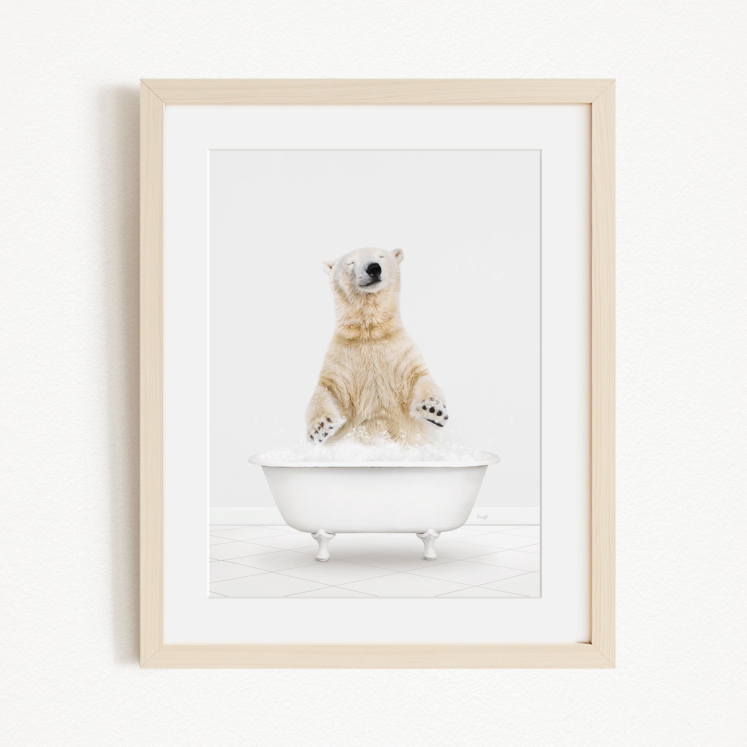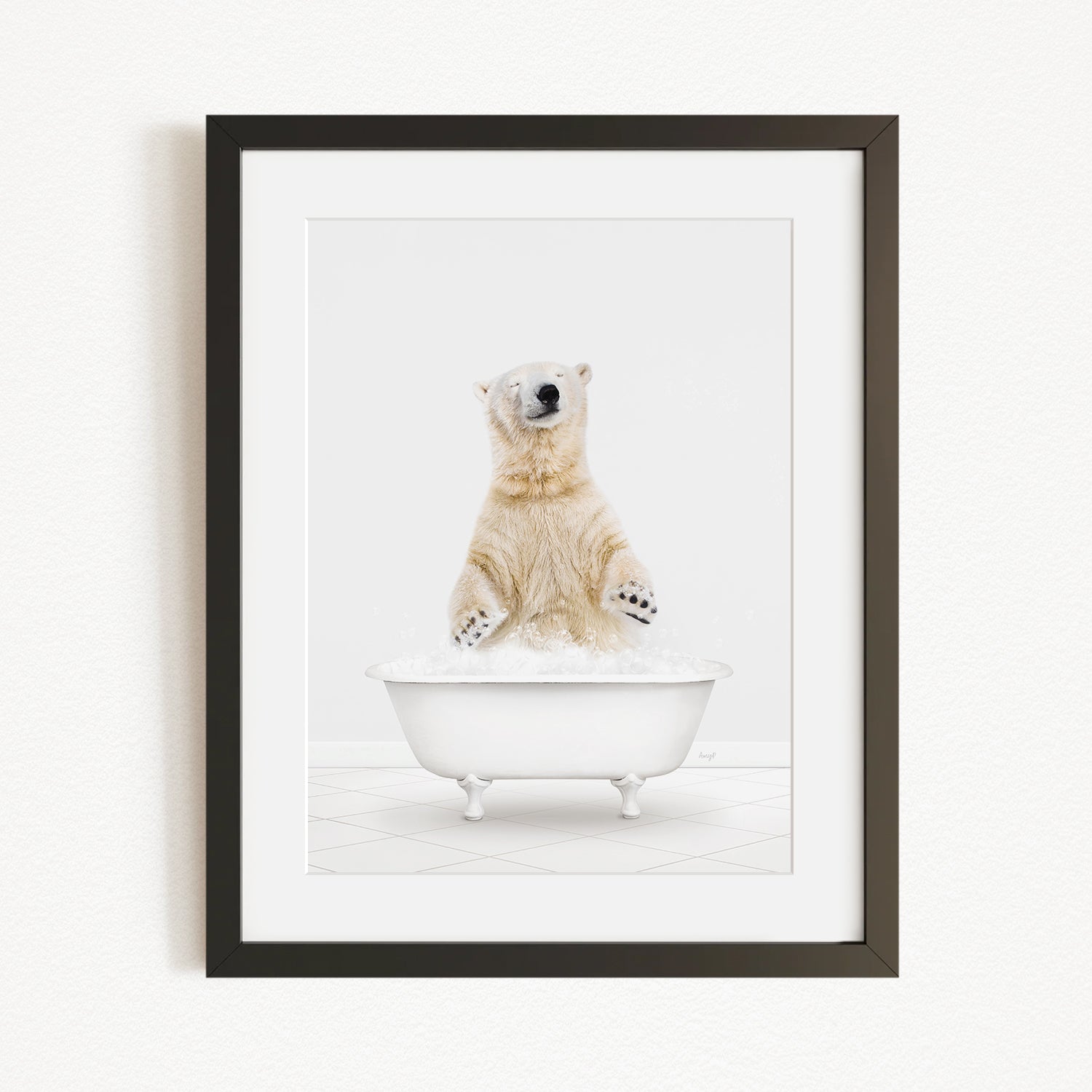 A polar bear sitting in a white bathtub filled with water, appearing to be enjoying a bath.