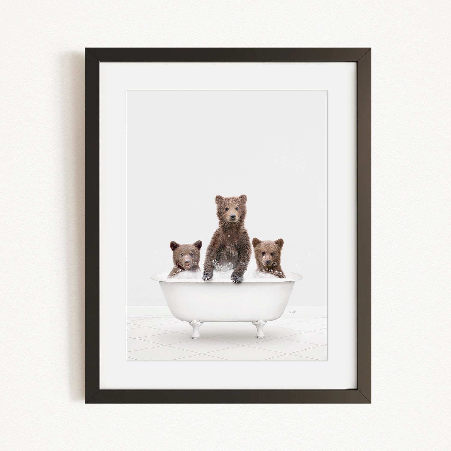 A framed image depicting three brown bears sitting in a white bathtub, with one bear sitting on the edge of the tub and the other two bears sitting inside the tub.