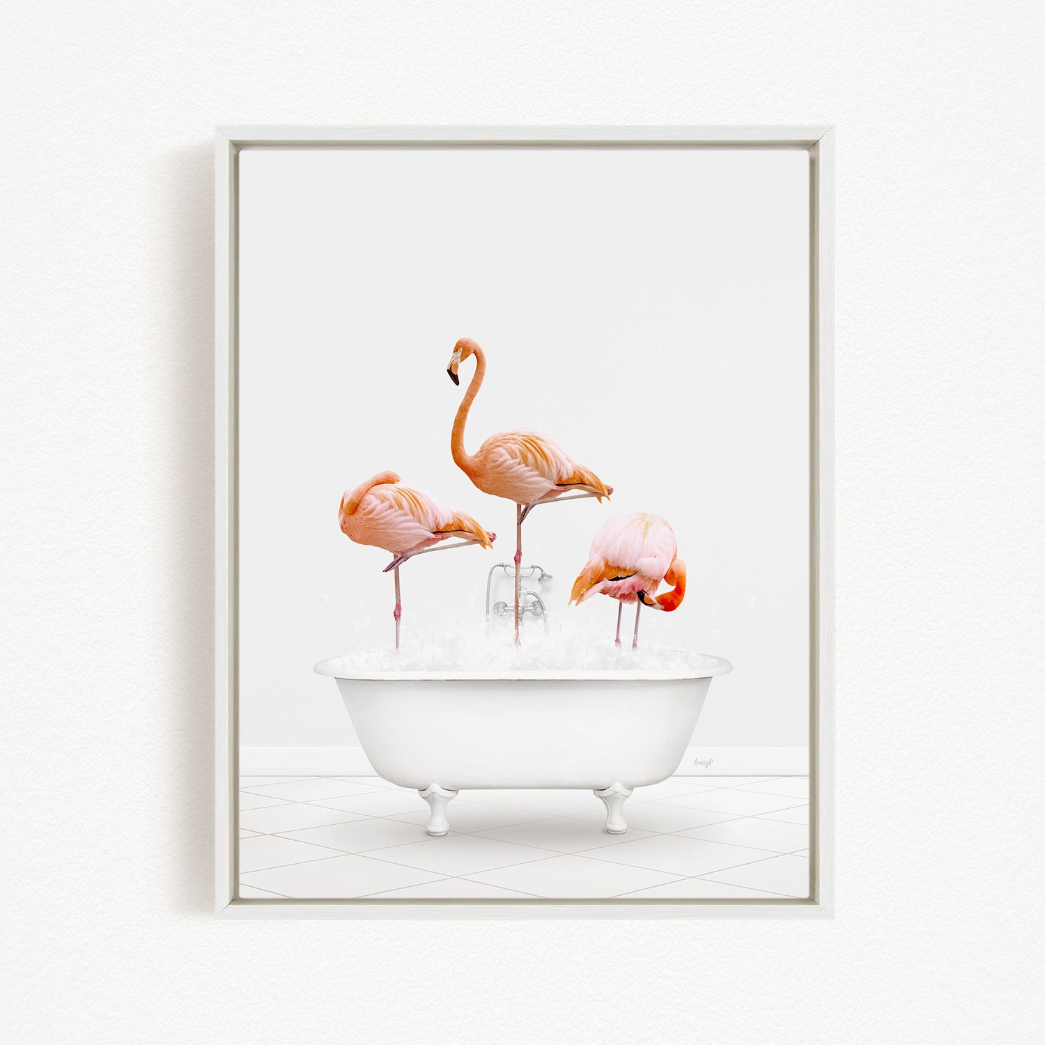 A framed image depicting three flamingos standing in a white bathtub filled with water.