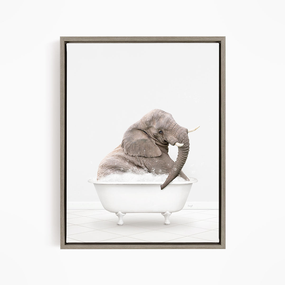 A gray elephant sitting in a white bathtub filled with bubbles, with a blurred background suggesting a bathroom setting.