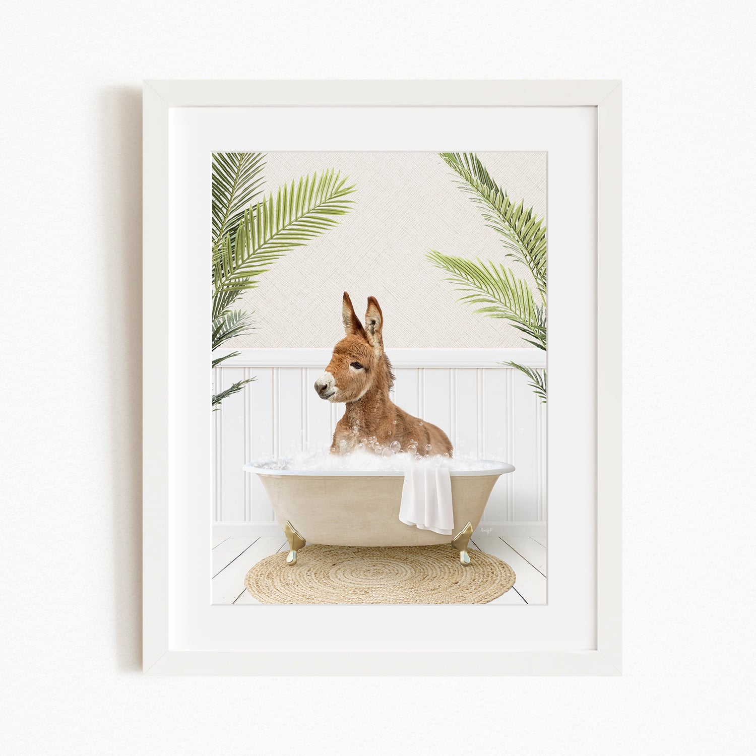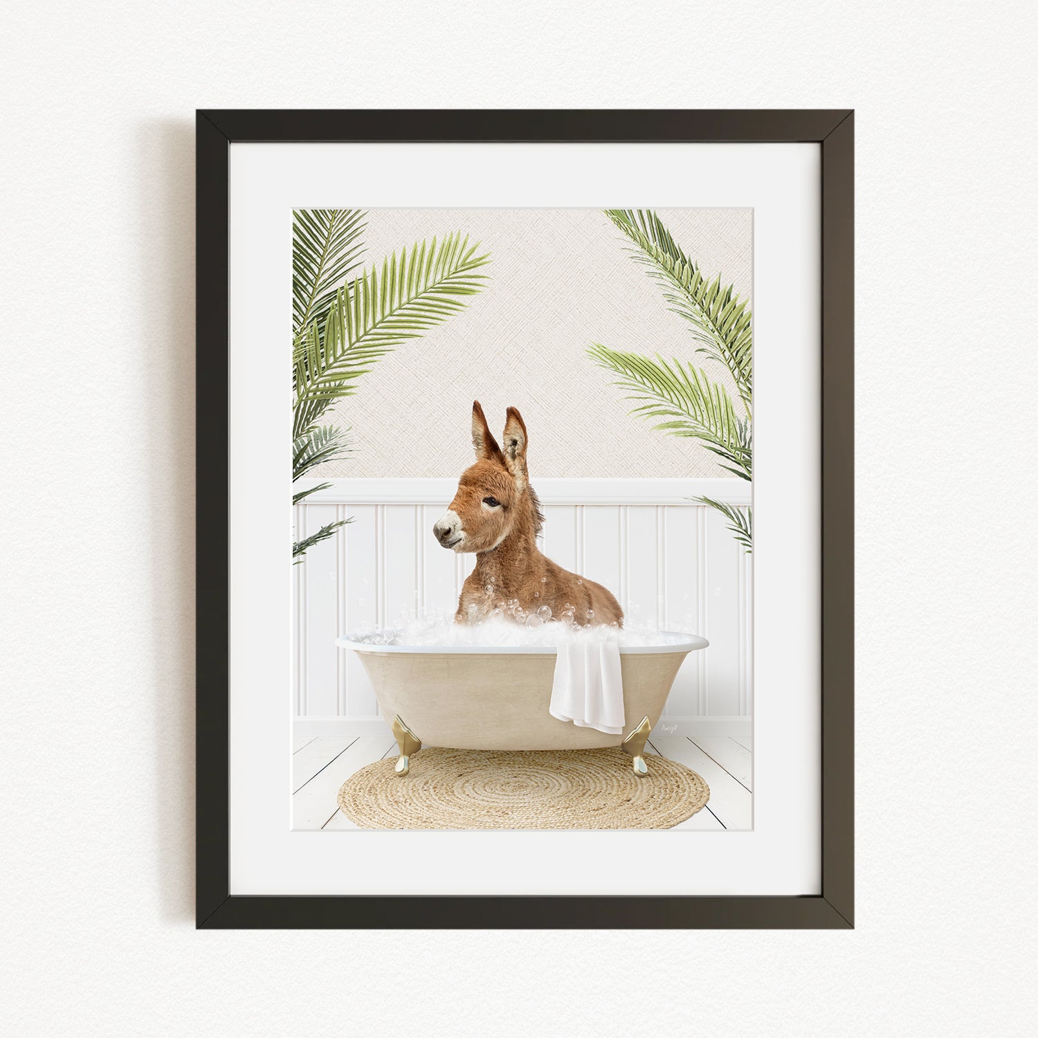 A donkey is sitting in a bathtub filled with water, surrounded by palm leaves, creating a whimsical and playful scene.