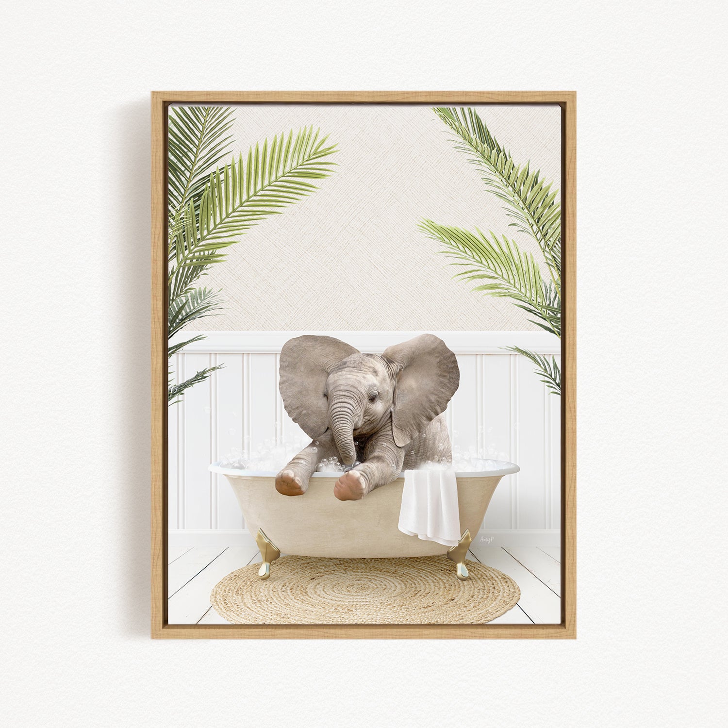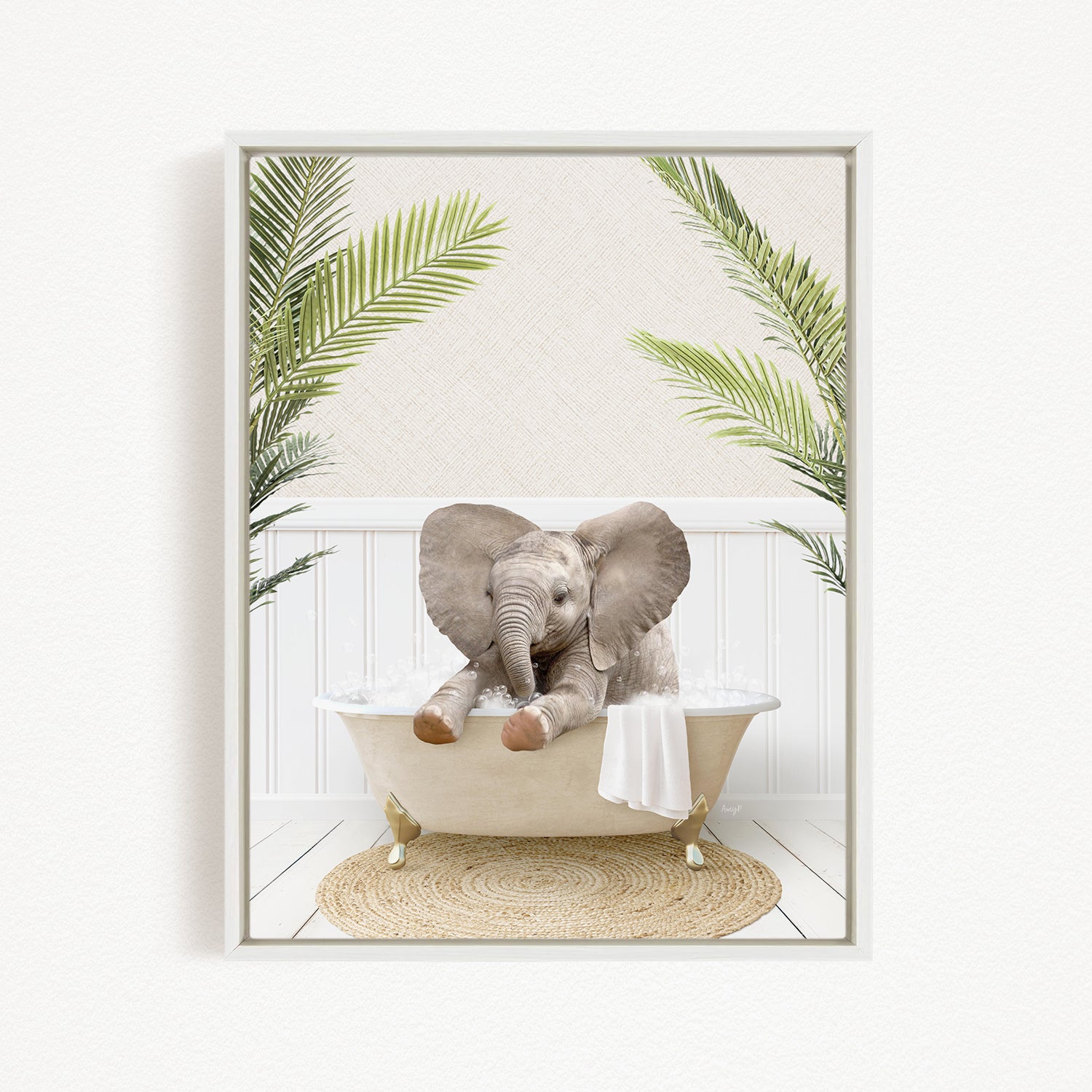 A framed image of a baby elephant sitting in a bathtub, surrounded by palm leaves.