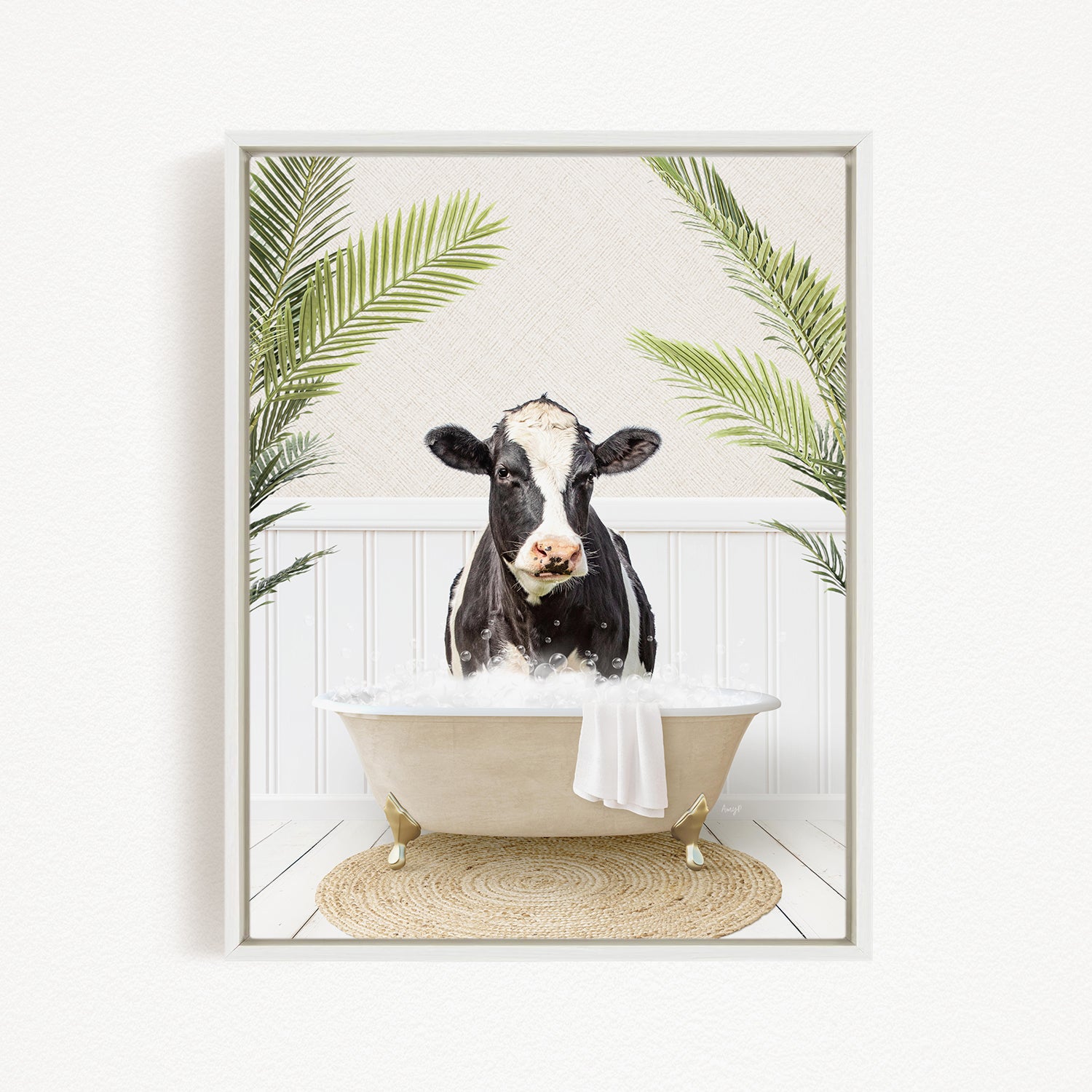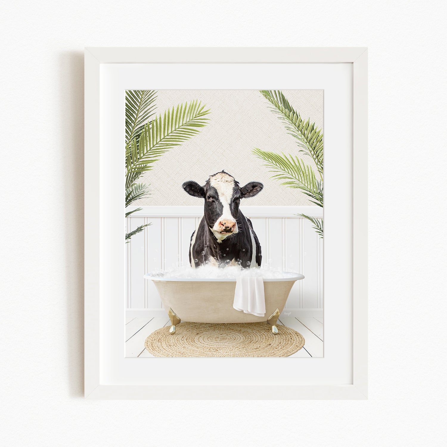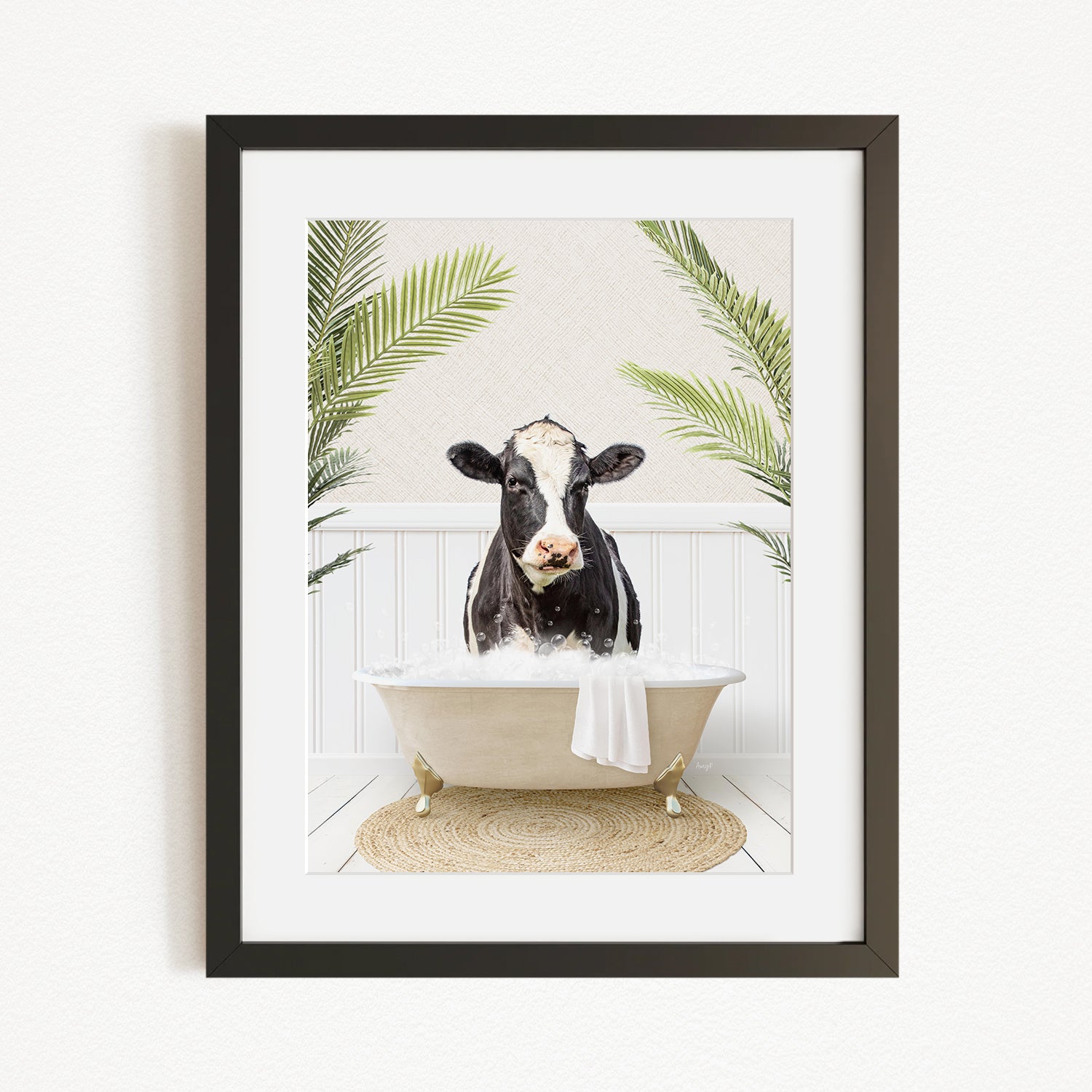 A black and white cow is sitting in a bathtub filled with water, surrounded by green palm leaves.