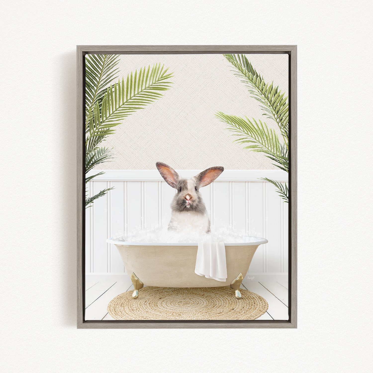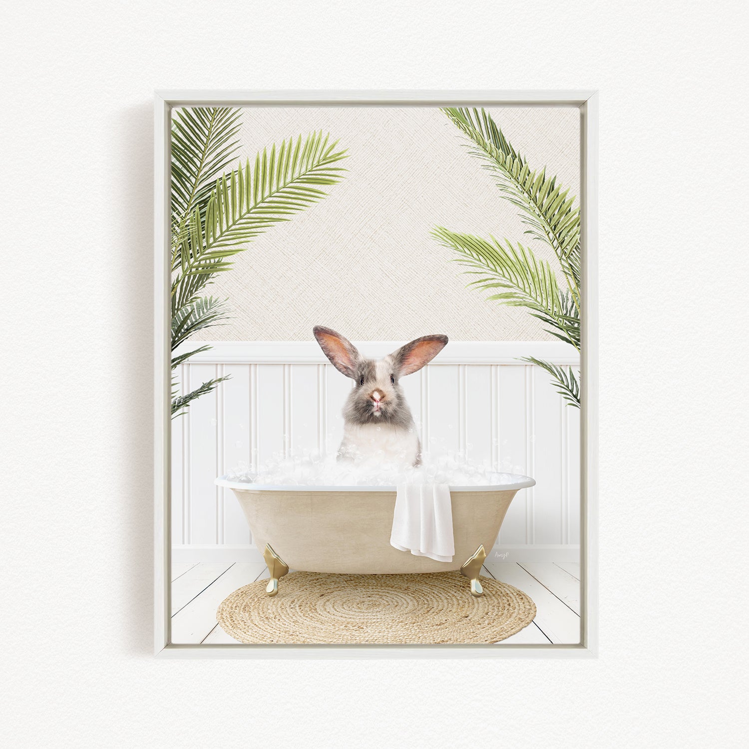 A white rabbit sitting in a bathtub filled with bubbles, surrounded by green palm leaves, creating a whimsical and playful scene.