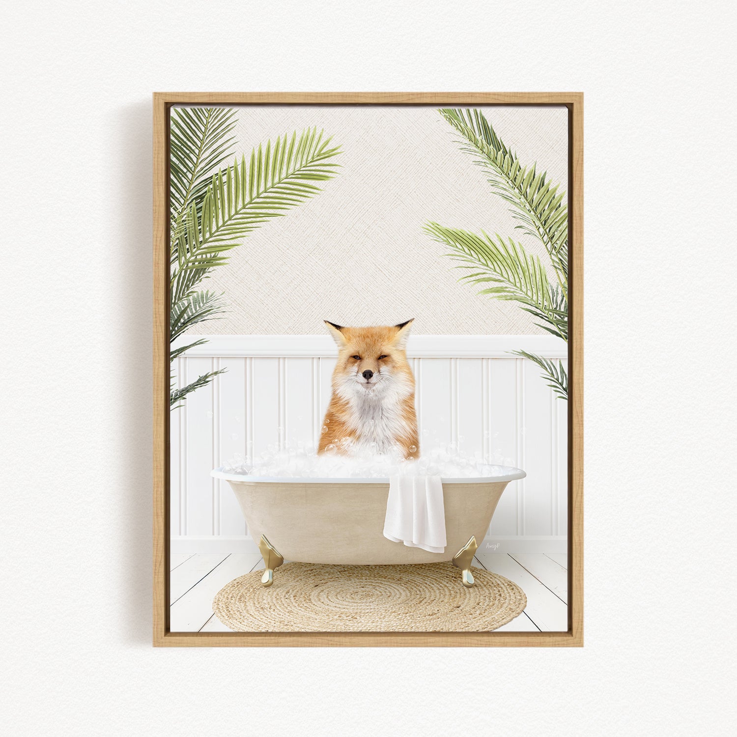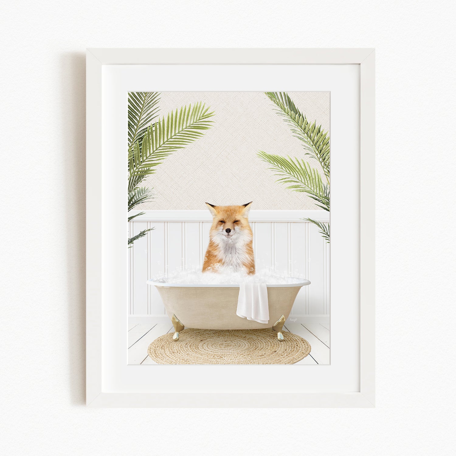 A framed image depicting a fox sitting in a bathtub filled with bubbles, surrounded by green palm leaves.