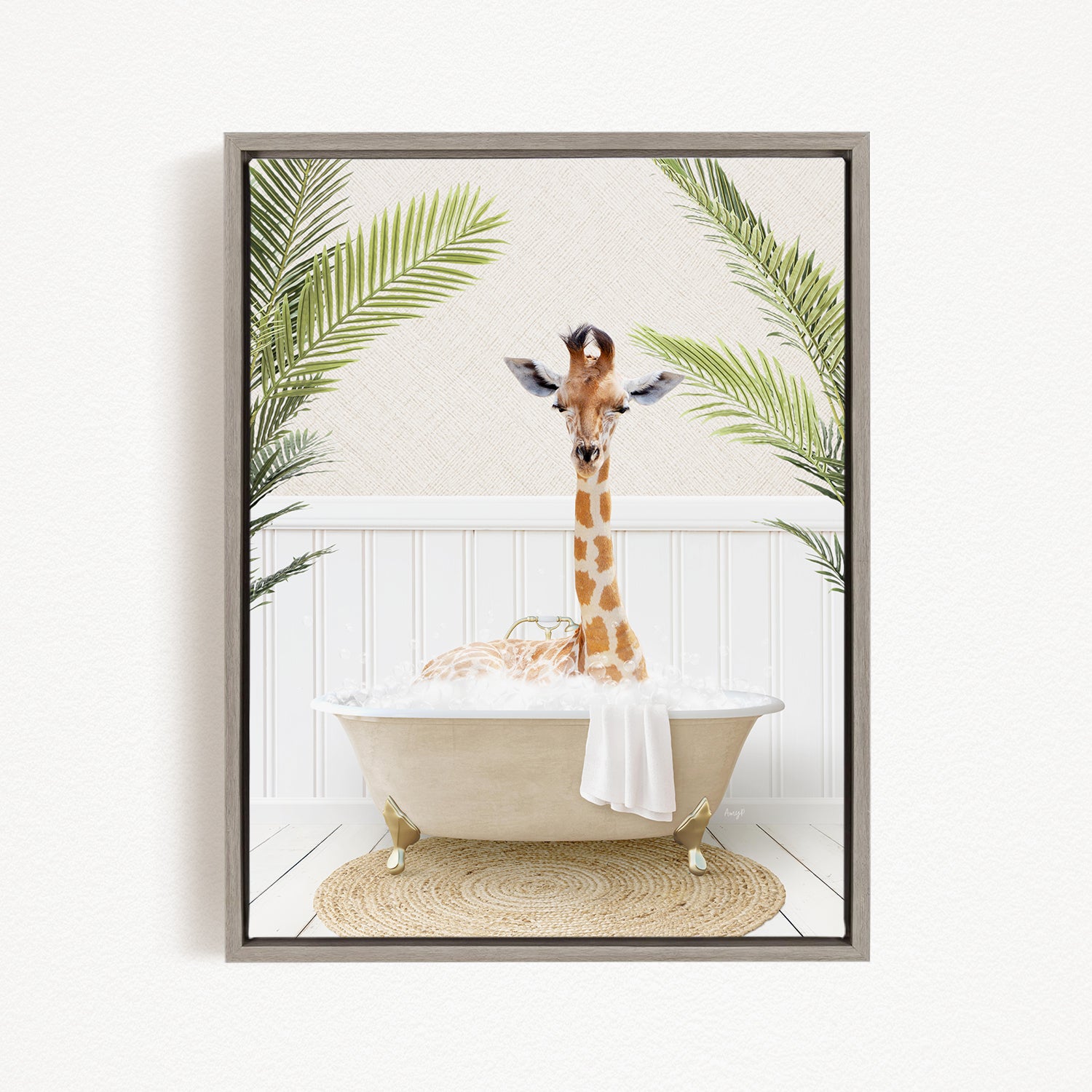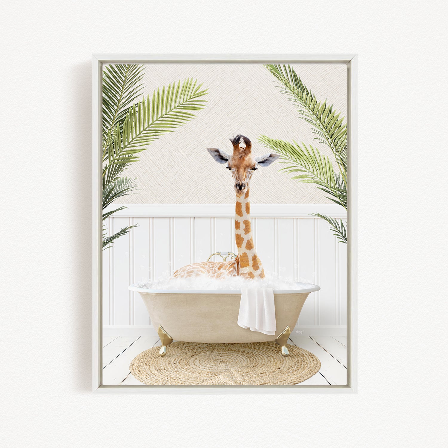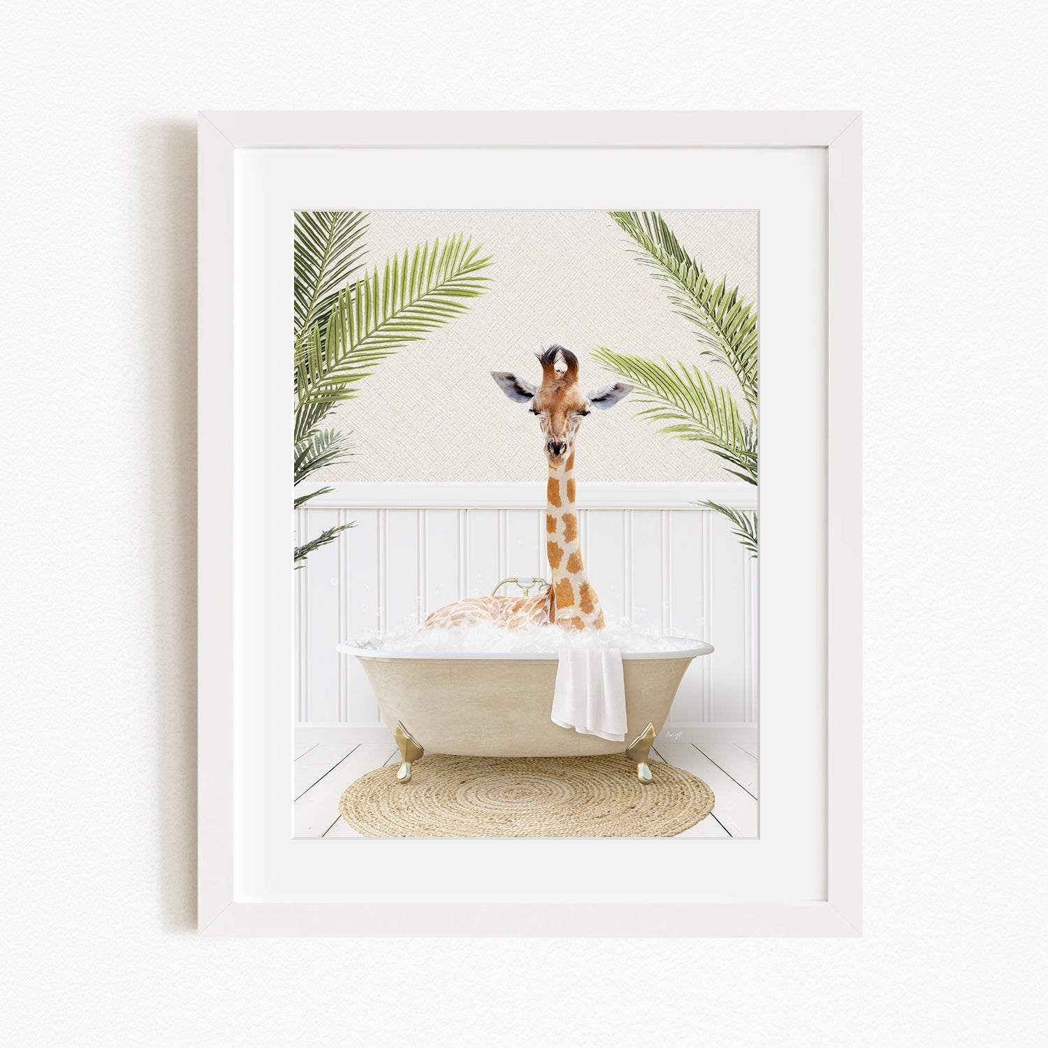 A giraffe is sitting in a bathtub filled with bubbles, surrounded by palm leaves, creating a whimsical and playful scene.