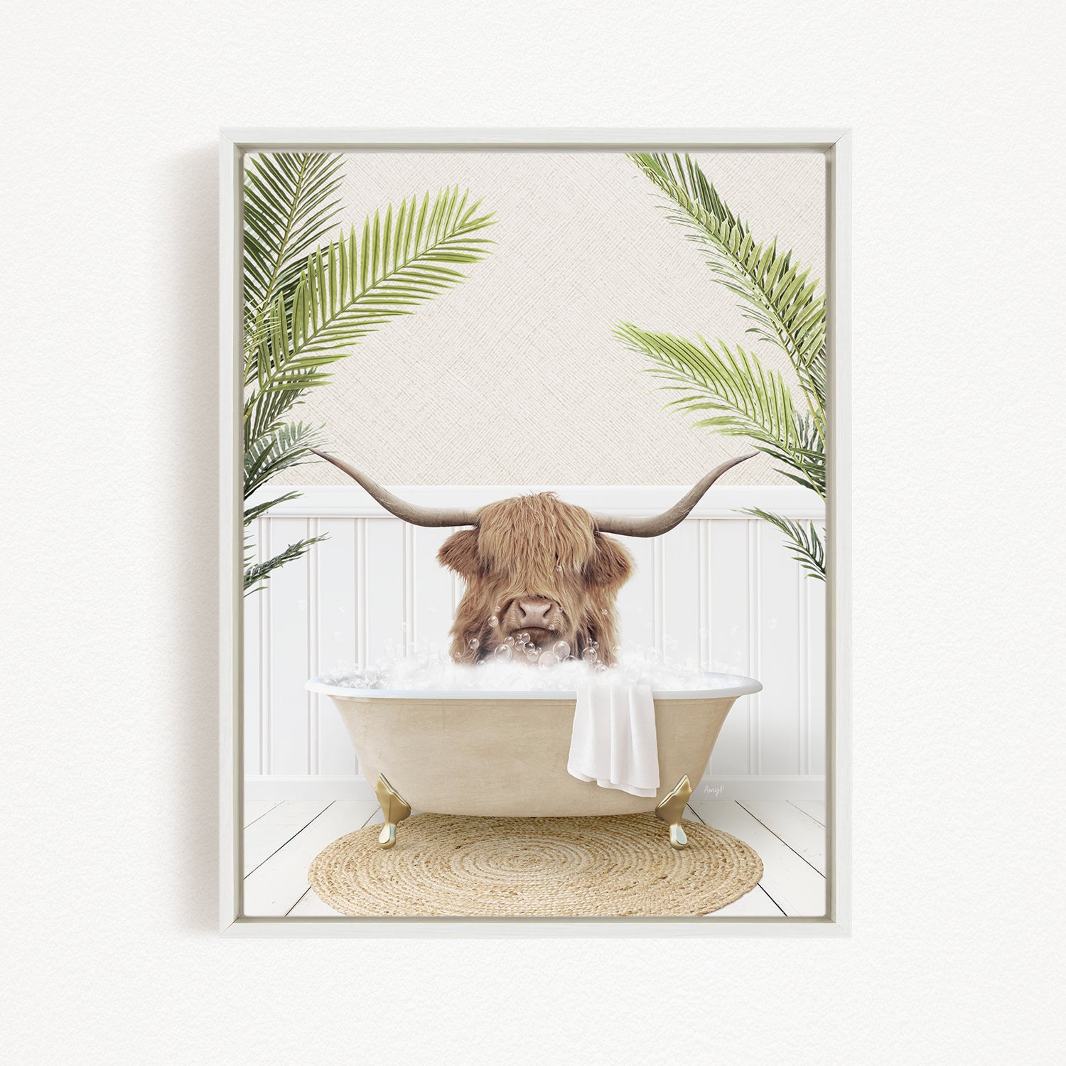 A framed image depicting a Highland cow with long horns sitting in a bathtub filled with bubbles, surrounded by green palm fronds.