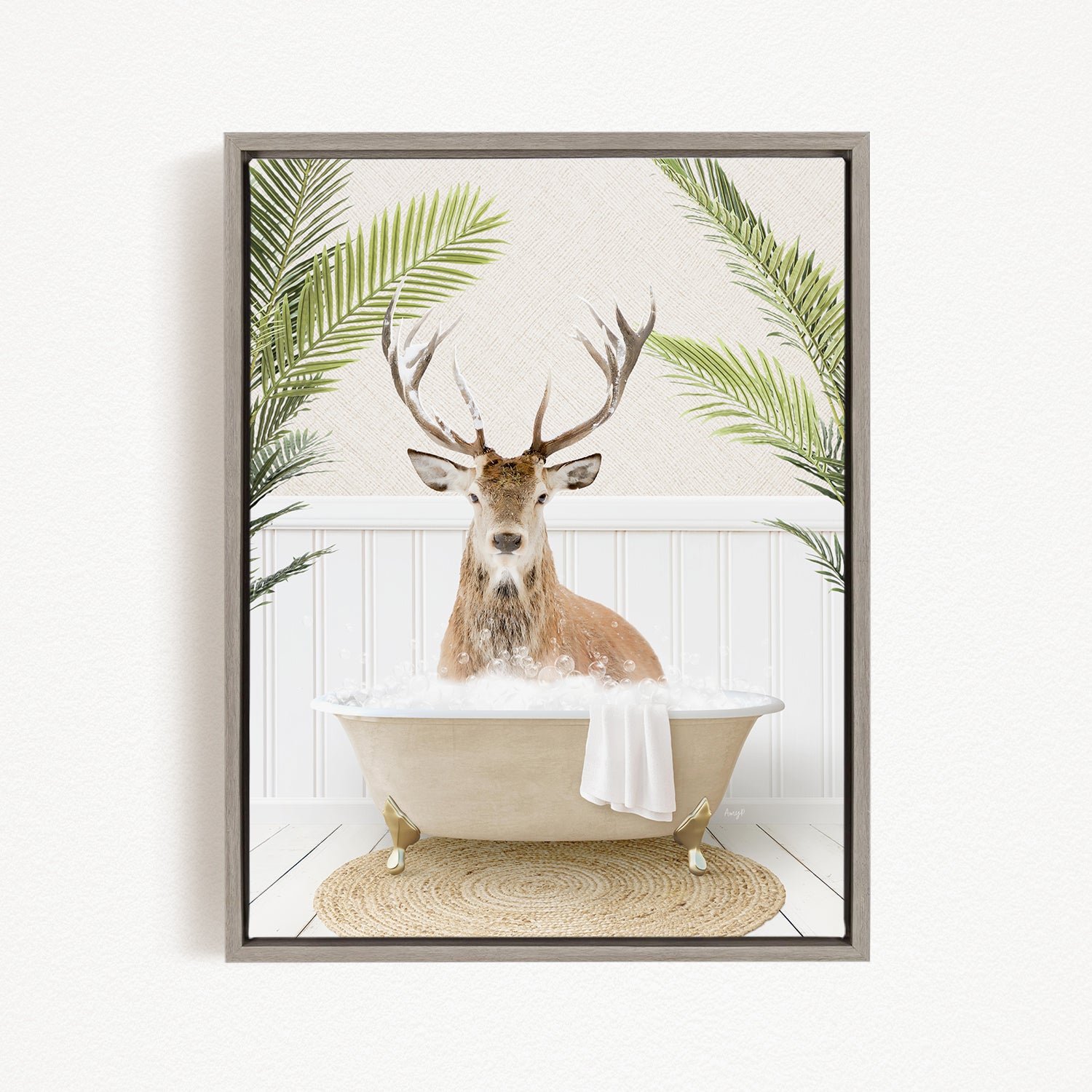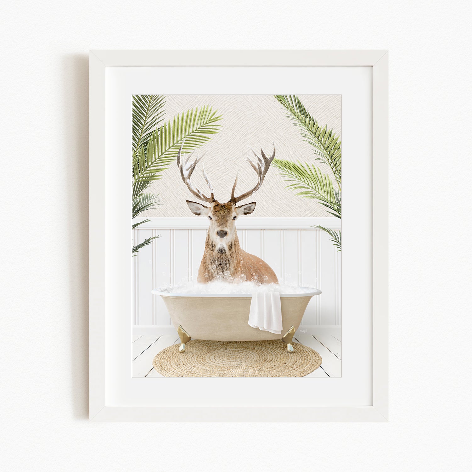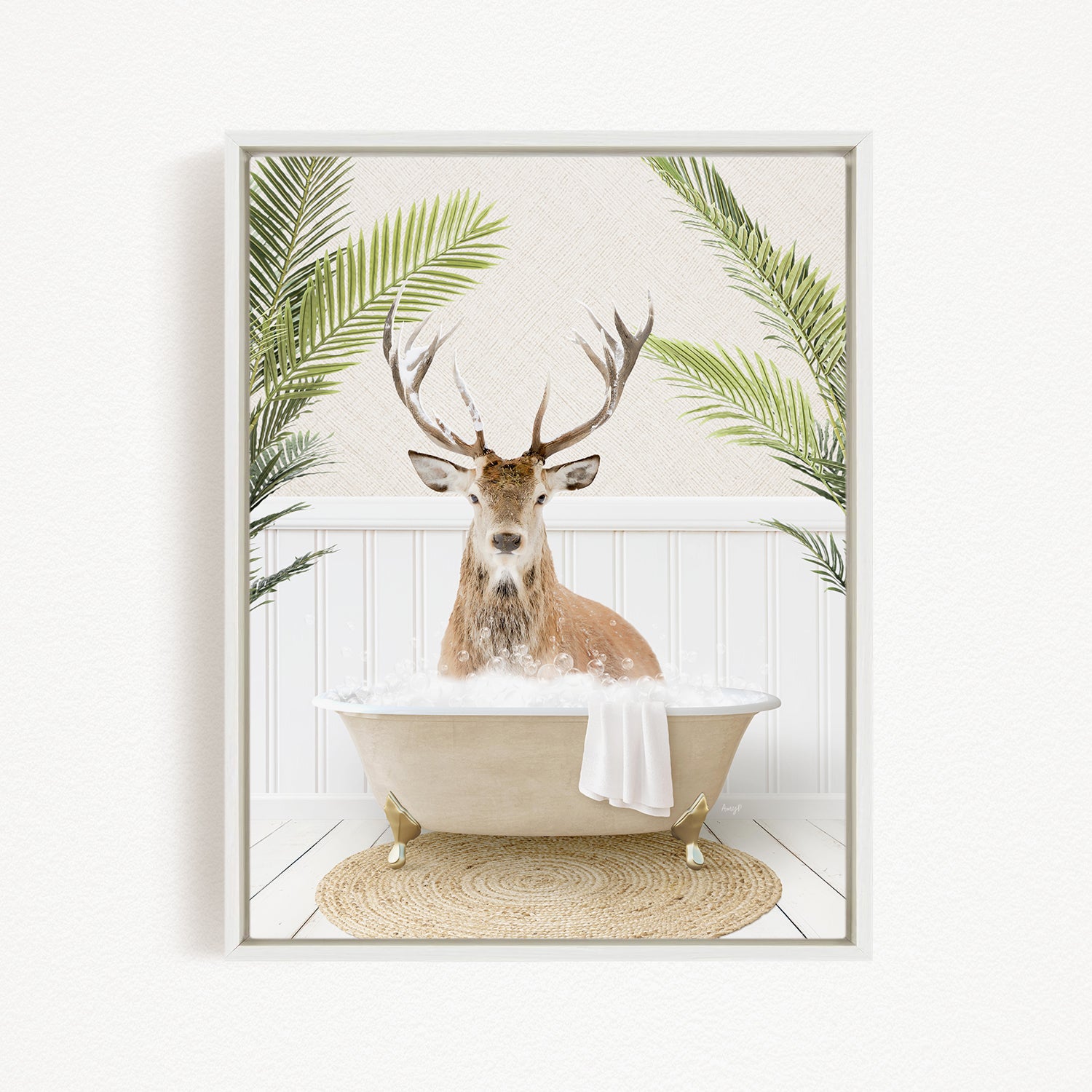 A deer with antlers is sitting in a bathtub filled with bubbles, surrounded by green palm fronds.