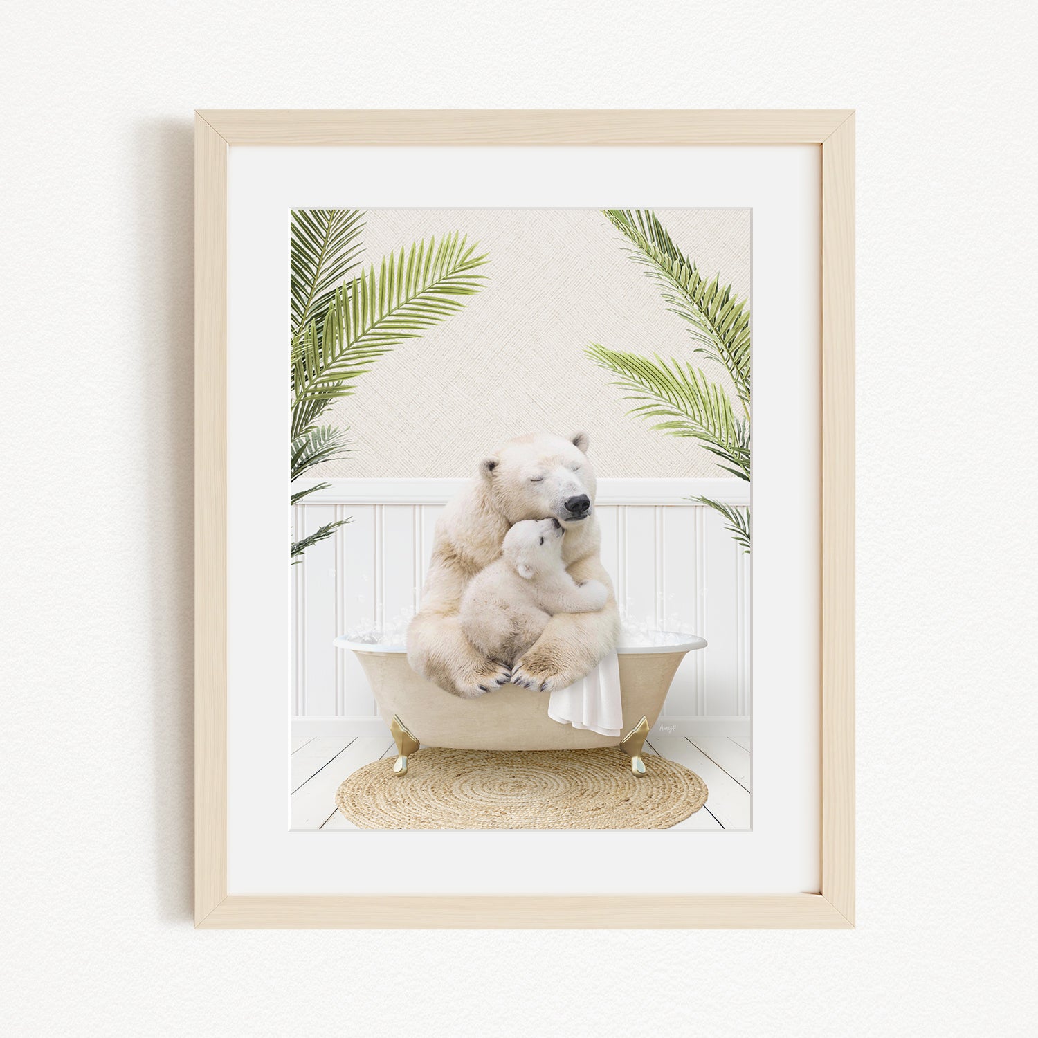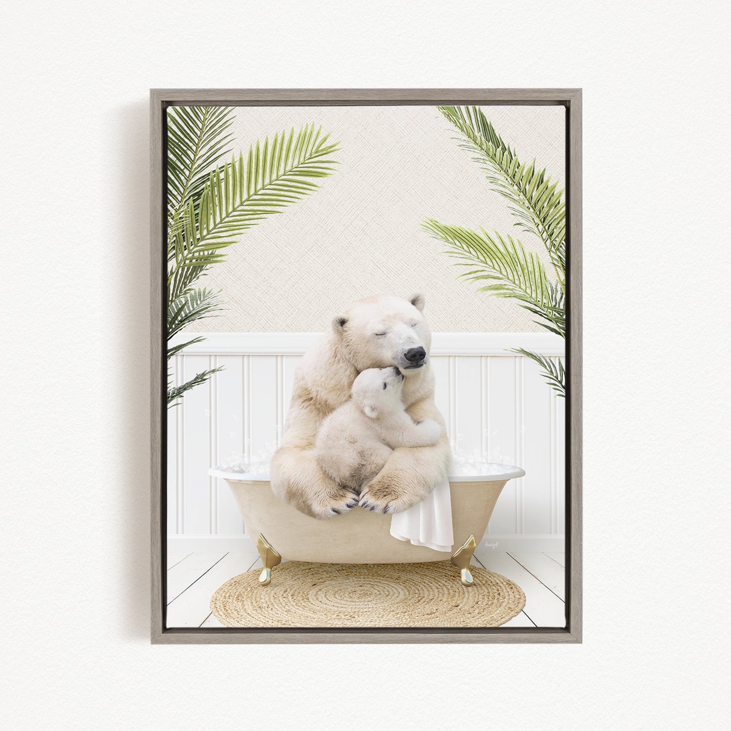 A framed image depicting two polar bears sitting in a bathtub, surrounded by palm leaves.