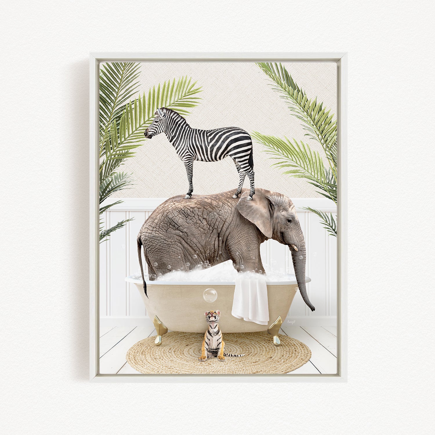 A framed image depicting a zebra standing on an elephant's back while the elephant is submerged in a bathtub, with a tiger sitting on the edge of the tub.