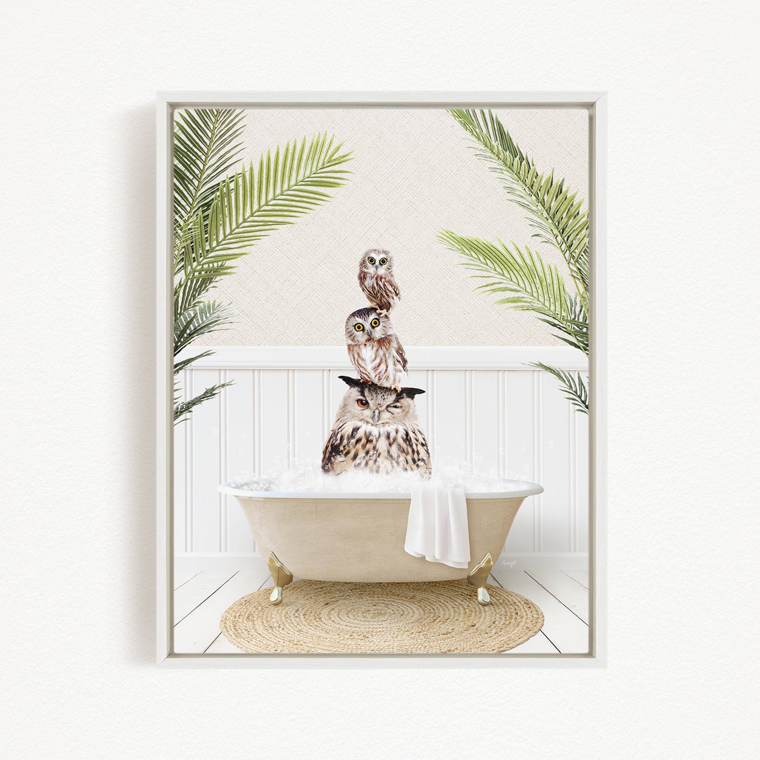 A framed image depicting three owls sitting in a bathtub, surrounded by green palm leaves.