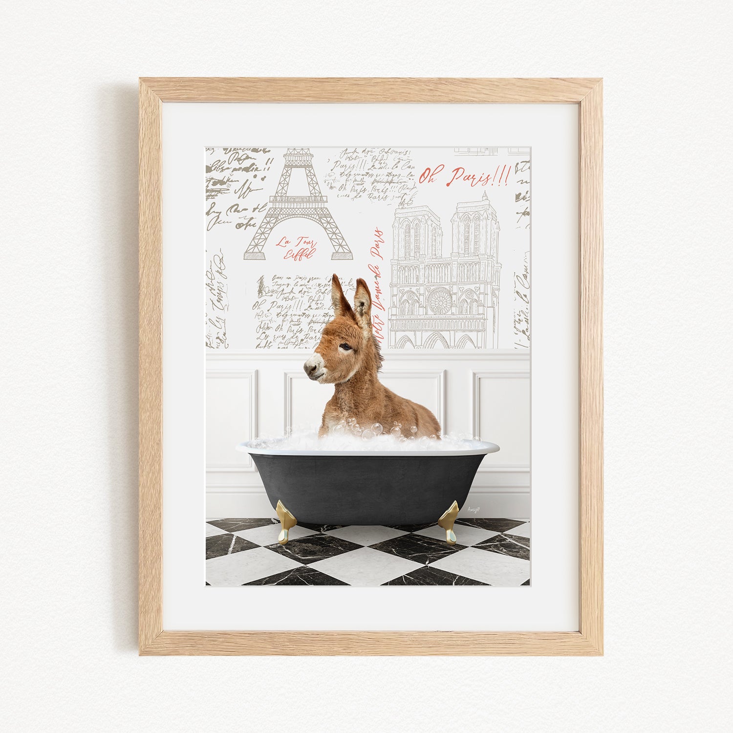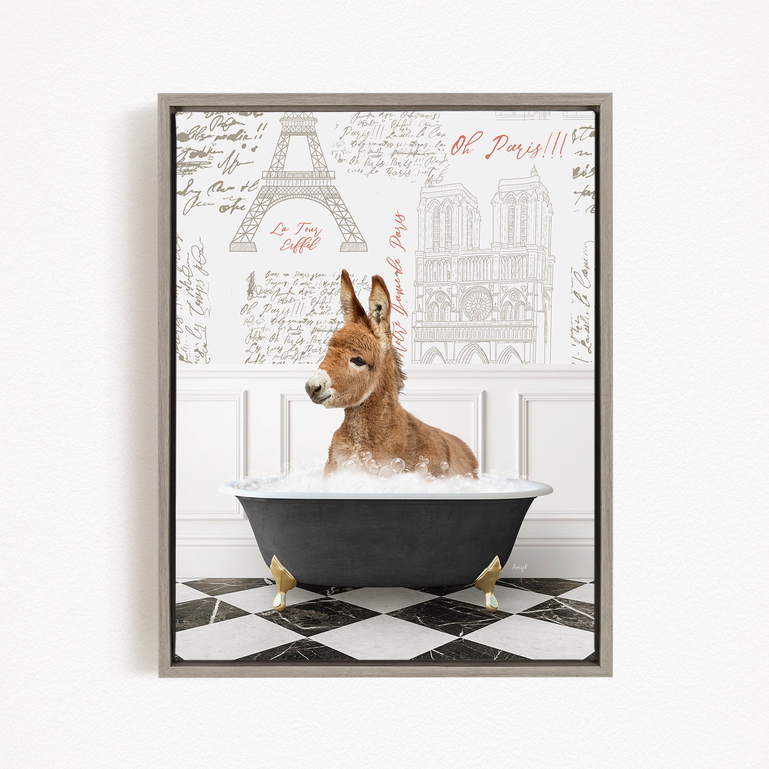 A donkey is sitting in a bathtub filled with water, surrounded by a checkered floor and a wall with the Eiffel Tower and other Parisian landmarks.