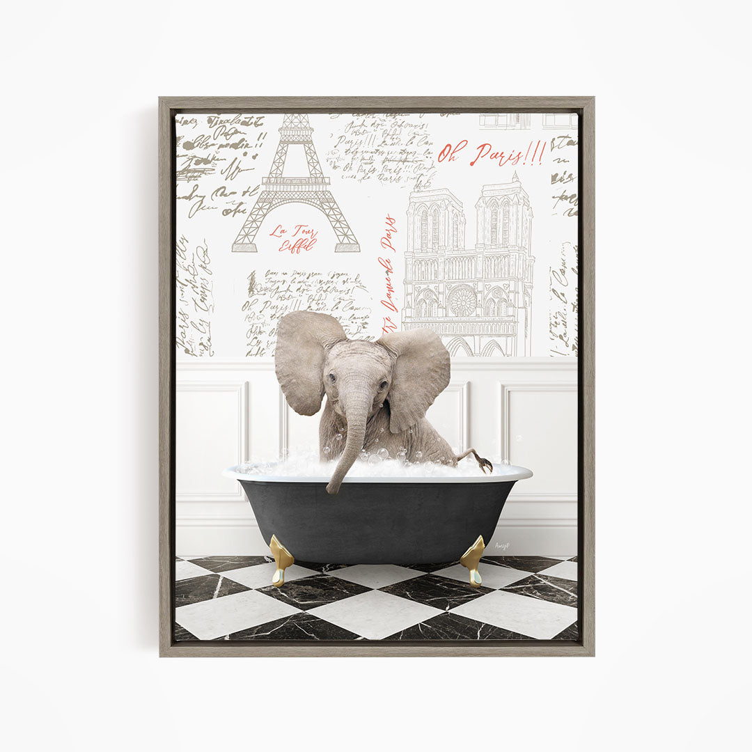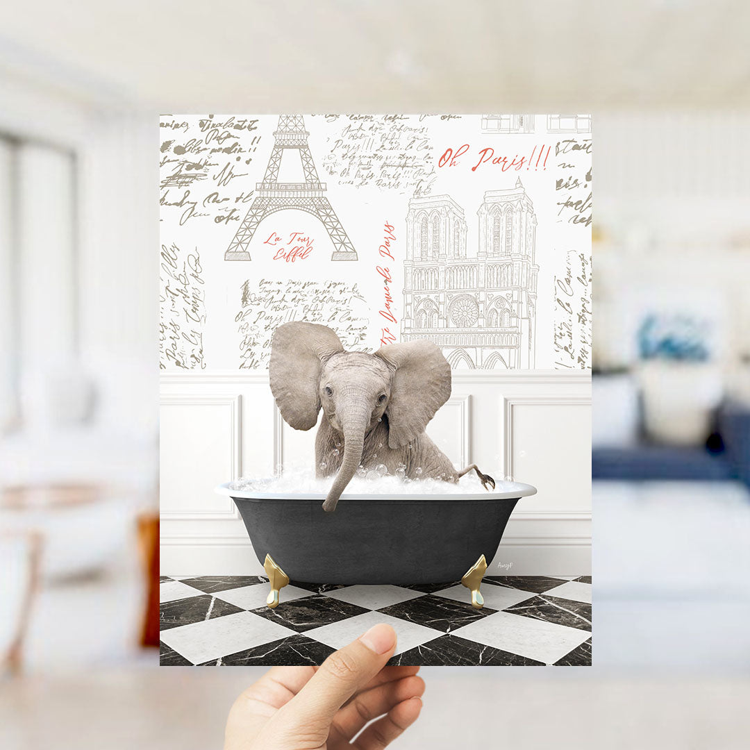 A hand holds up a printed image featuring an elephant sitting in a bathtub, surrounded by various Paris-themed elements such as the Eiffel Tower and the Notre-Dame Cathedral.