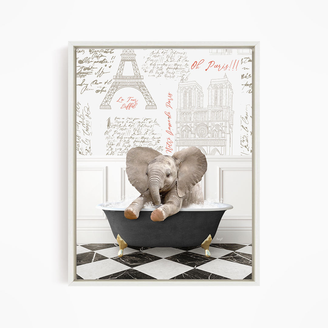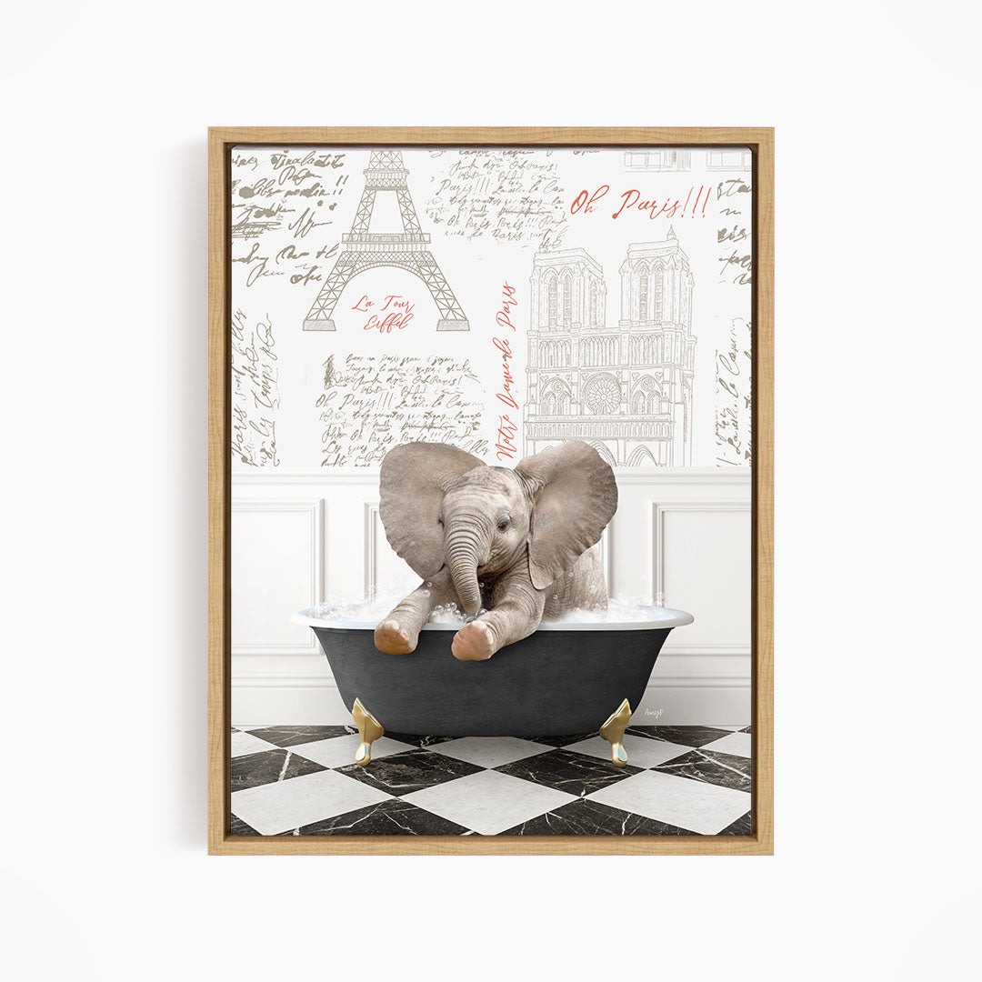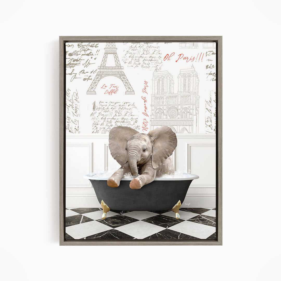 A framed image depicting a baby elephant sitting in a bathtub, surrounded by various Paris-themed elements such as the Eiffel Tower and other landmarks.