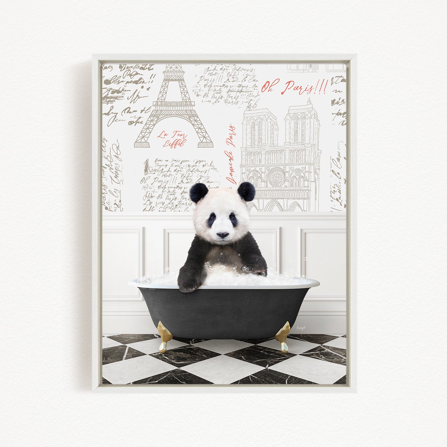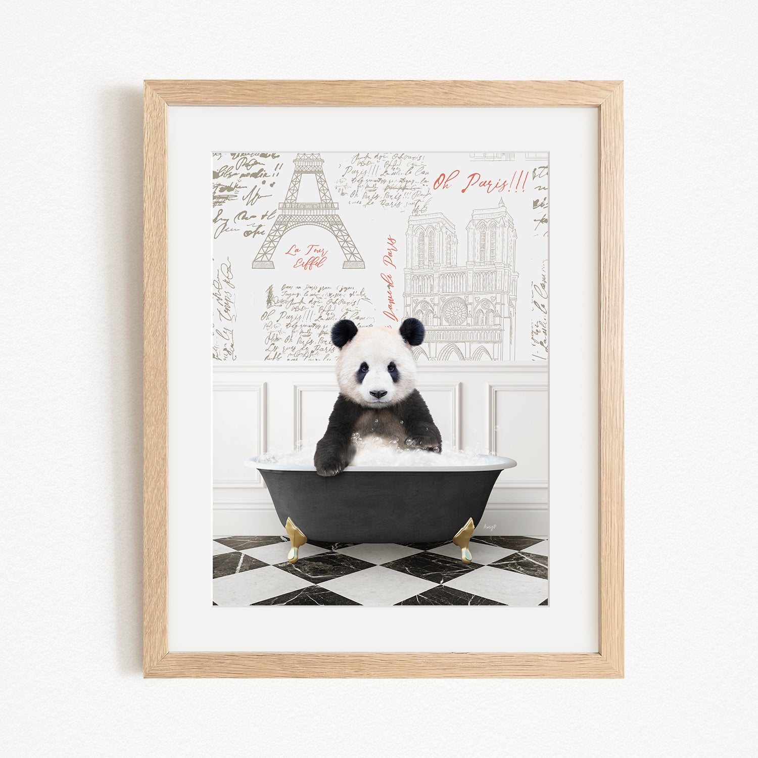 A panda bear sitting in a bathtub, surrounded by a checkered floor and a wall with the Eiffel Tower and other Parisian landmarks.
