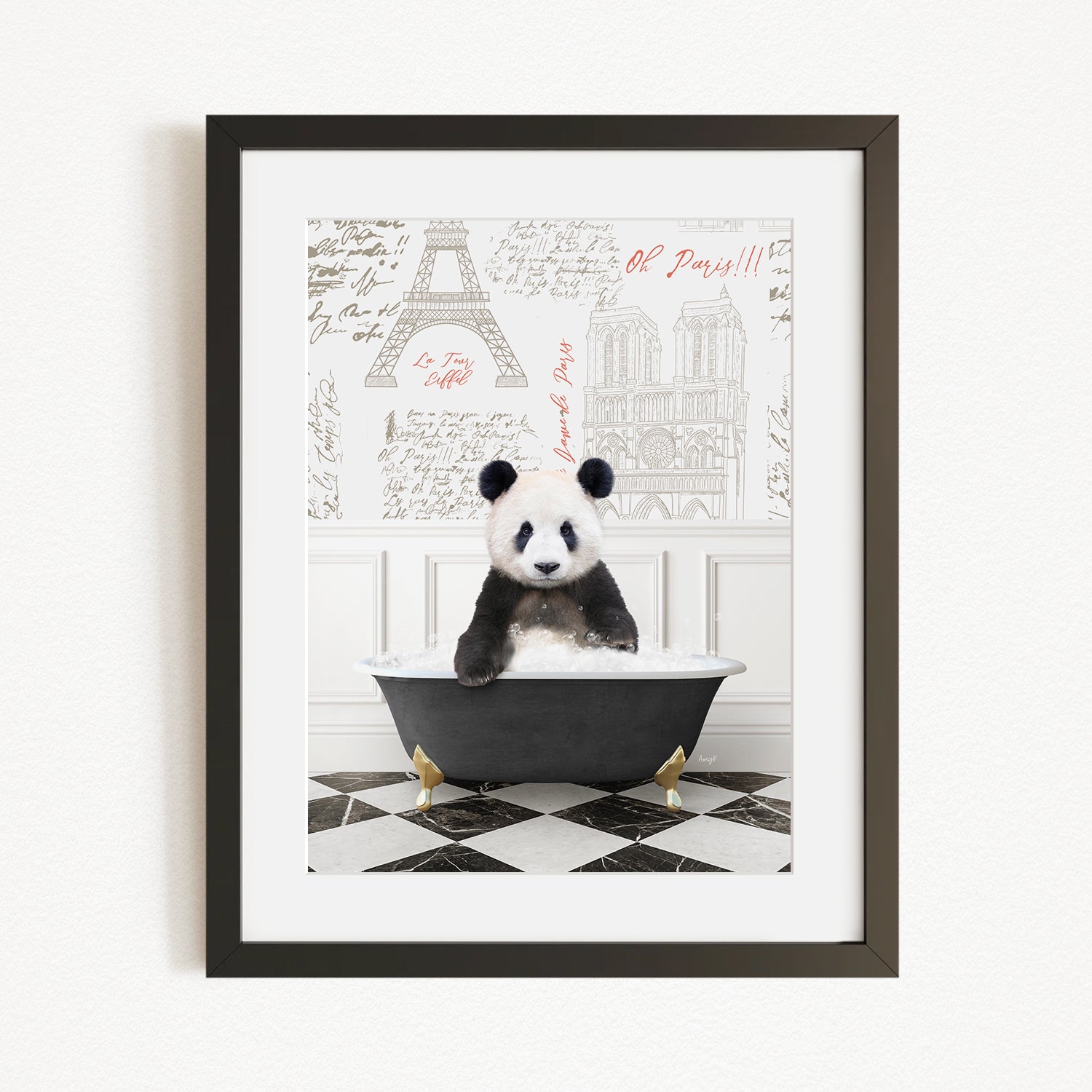 A panda bear sitting in a bathtub, surrounded by a Paris-themed background with the Eiffel Tower and other landmarks.