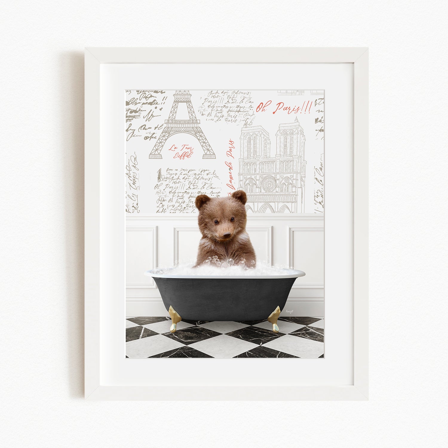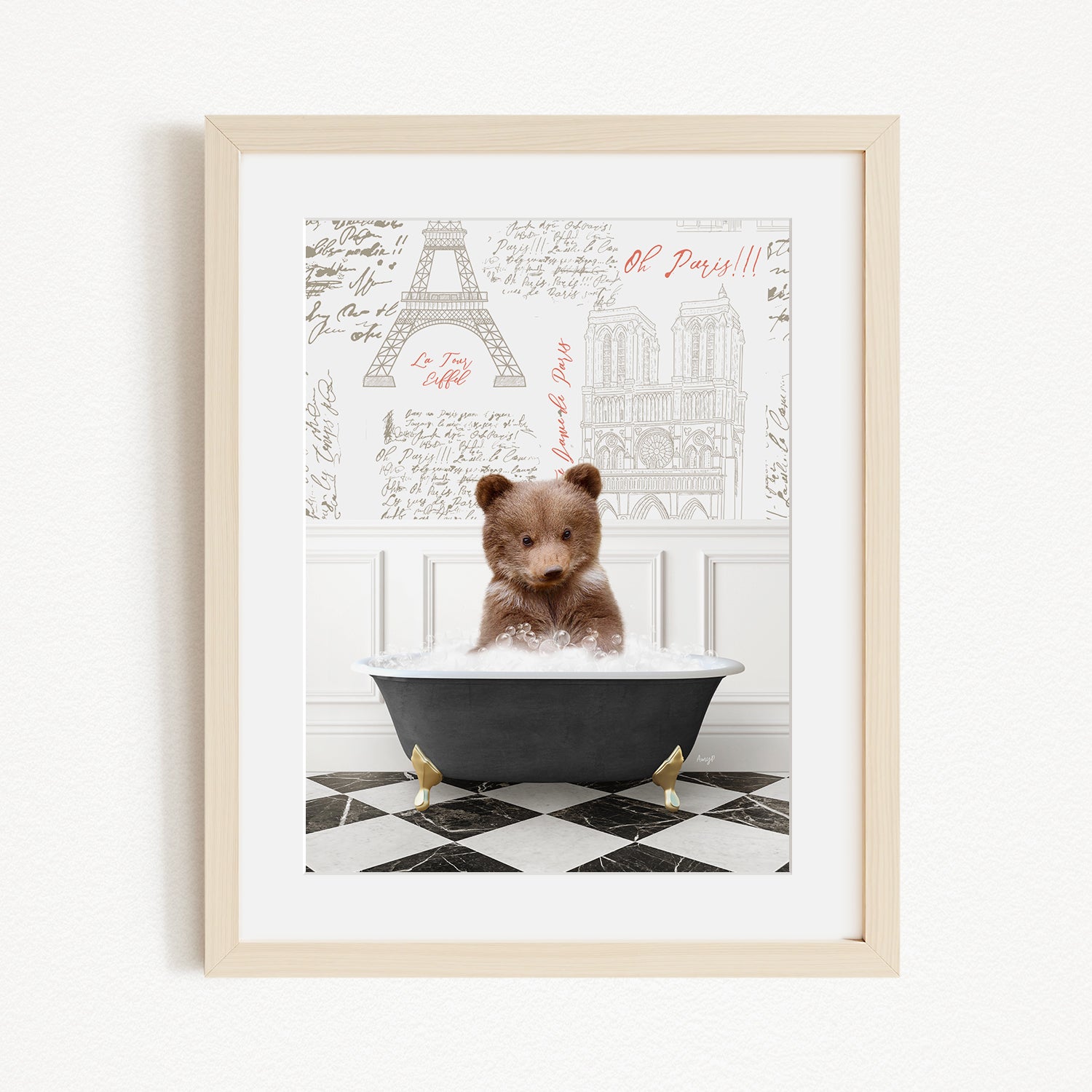 A cute brown bear sitting in a bathtub filled with bubbles, surrounded by a checkered floor and a framed image of the Eiffel Tower in the background.