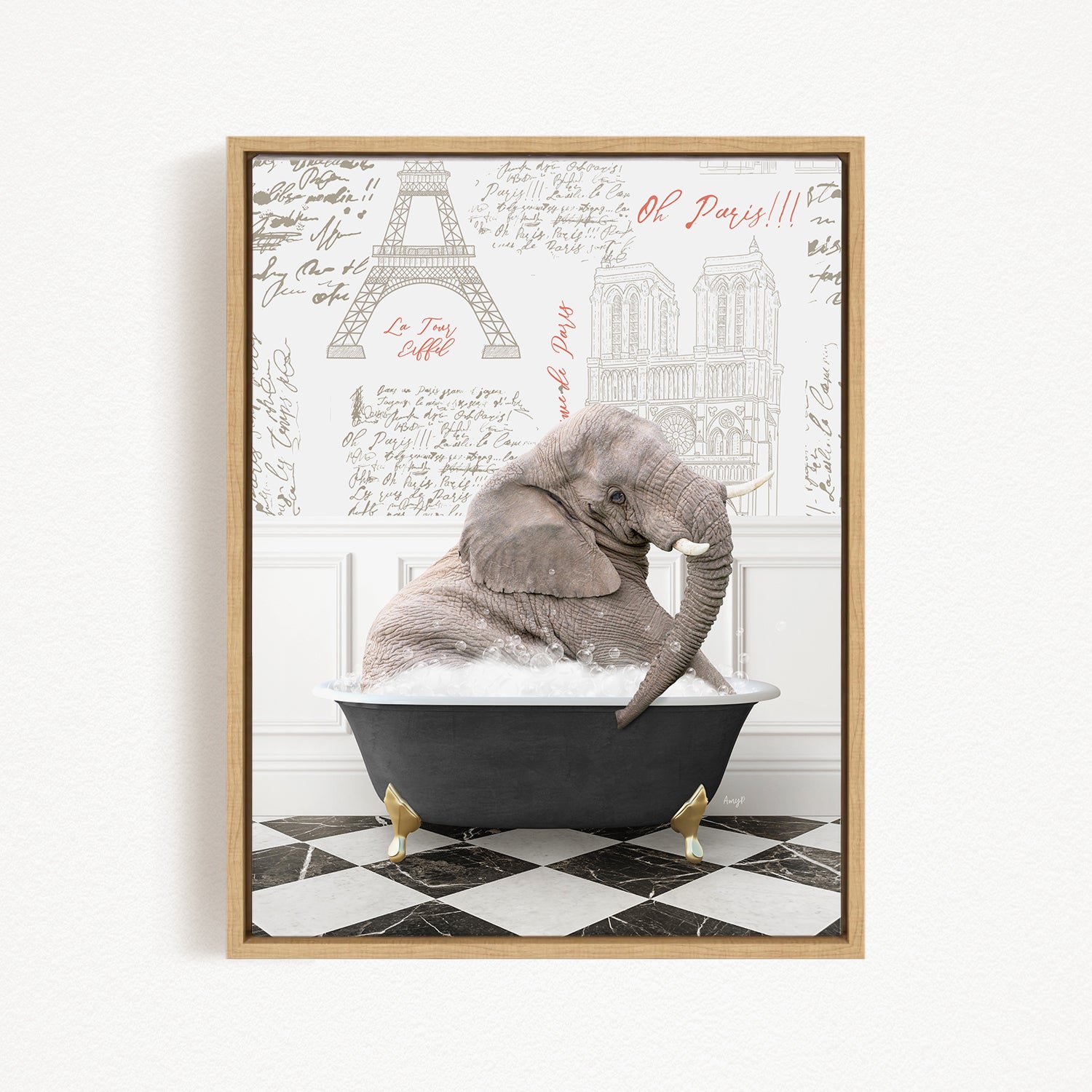 A framed image depicting an elephant sitting in a bathtub, with a Paris-themed background featuring the Eiffel Tower and other Parisian landmarks.