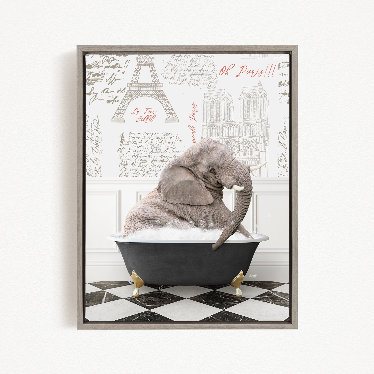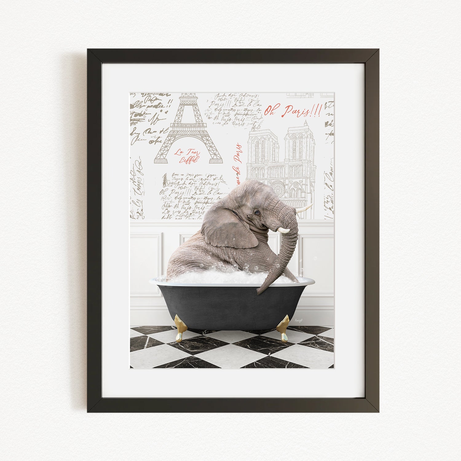 A framed image depicting a gray elephant sitting in a black bathtub filled with water, with a Paris-themed background featuring the Eiffel Tower and other Parisian landmarks.