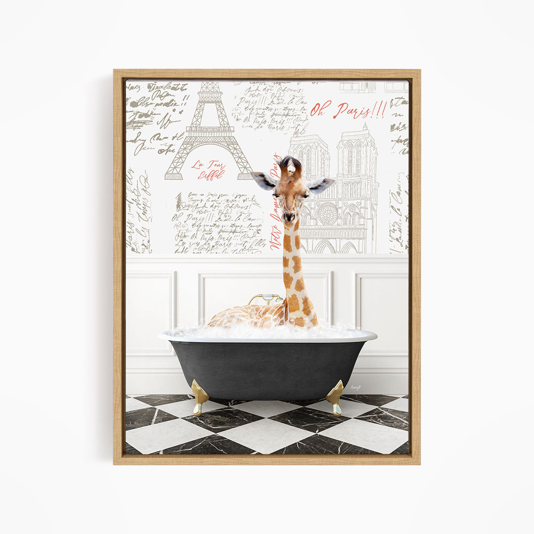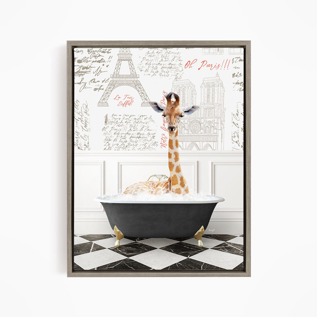 A giraffe sitting in a bathtub filled with bubbles, surrounded by a Paris-themed background with the Eiffel Tower and other landmarks.