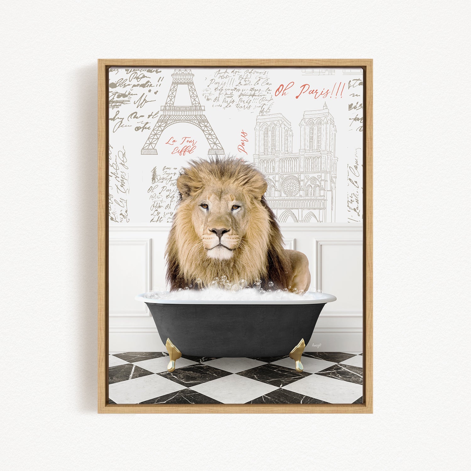 A framed image of a lion sitting in a bathtub, with a checkered floor and a drawing of the Eiffel Tower in the background.
