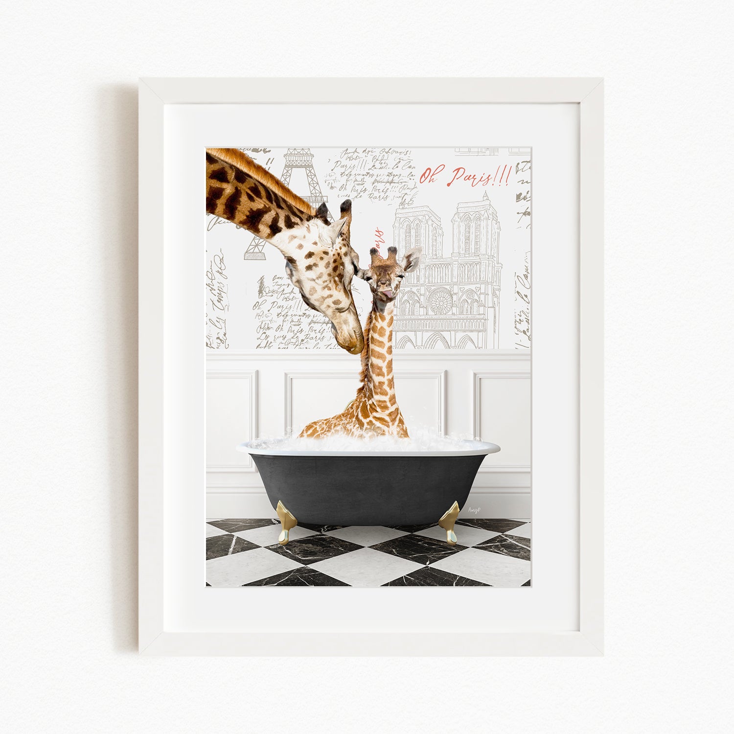 A framed image depicting two giraffes in a bathtub, with one giraffe appearing to be bathing the other. The background features a drawing of a building and the text "Oh Paris!!".