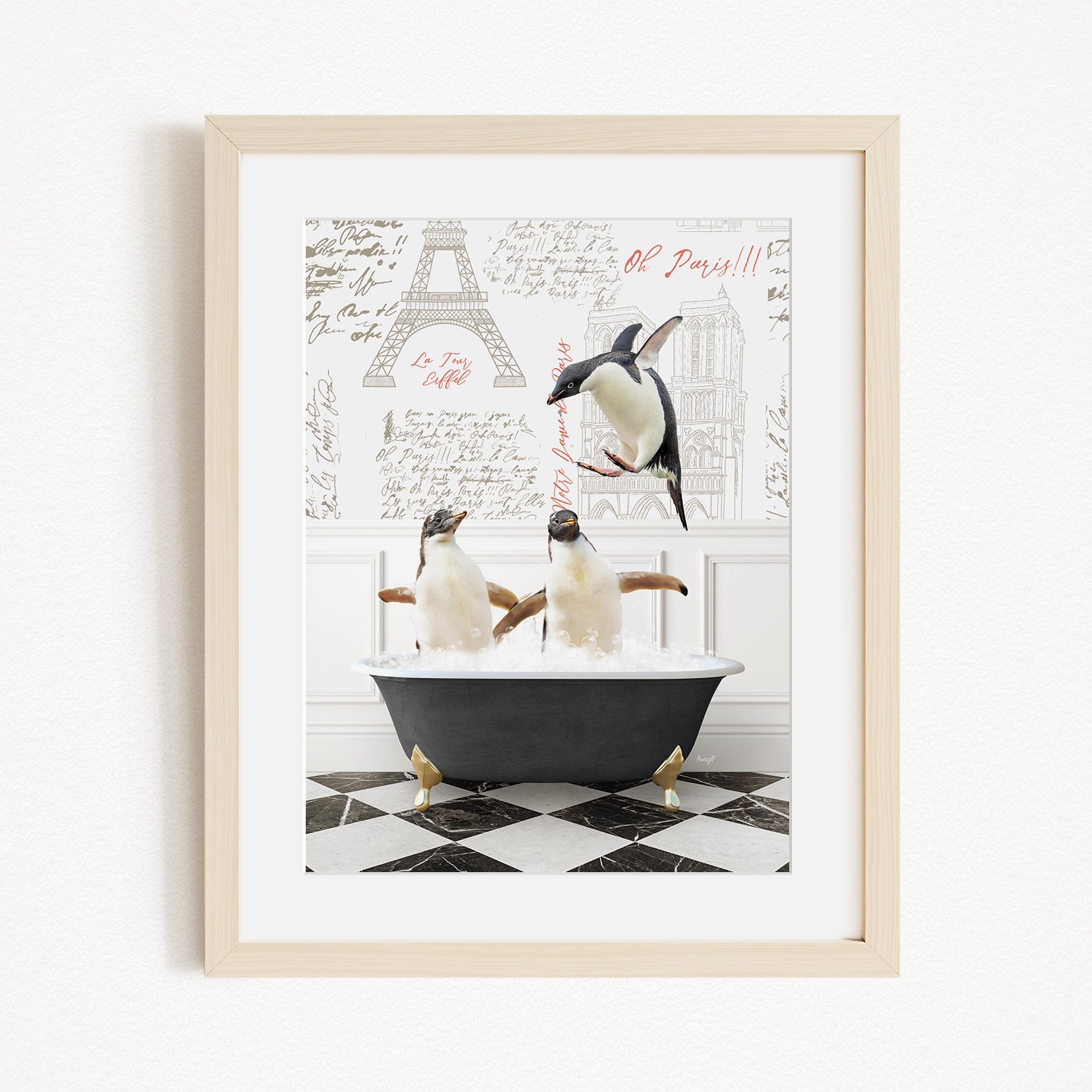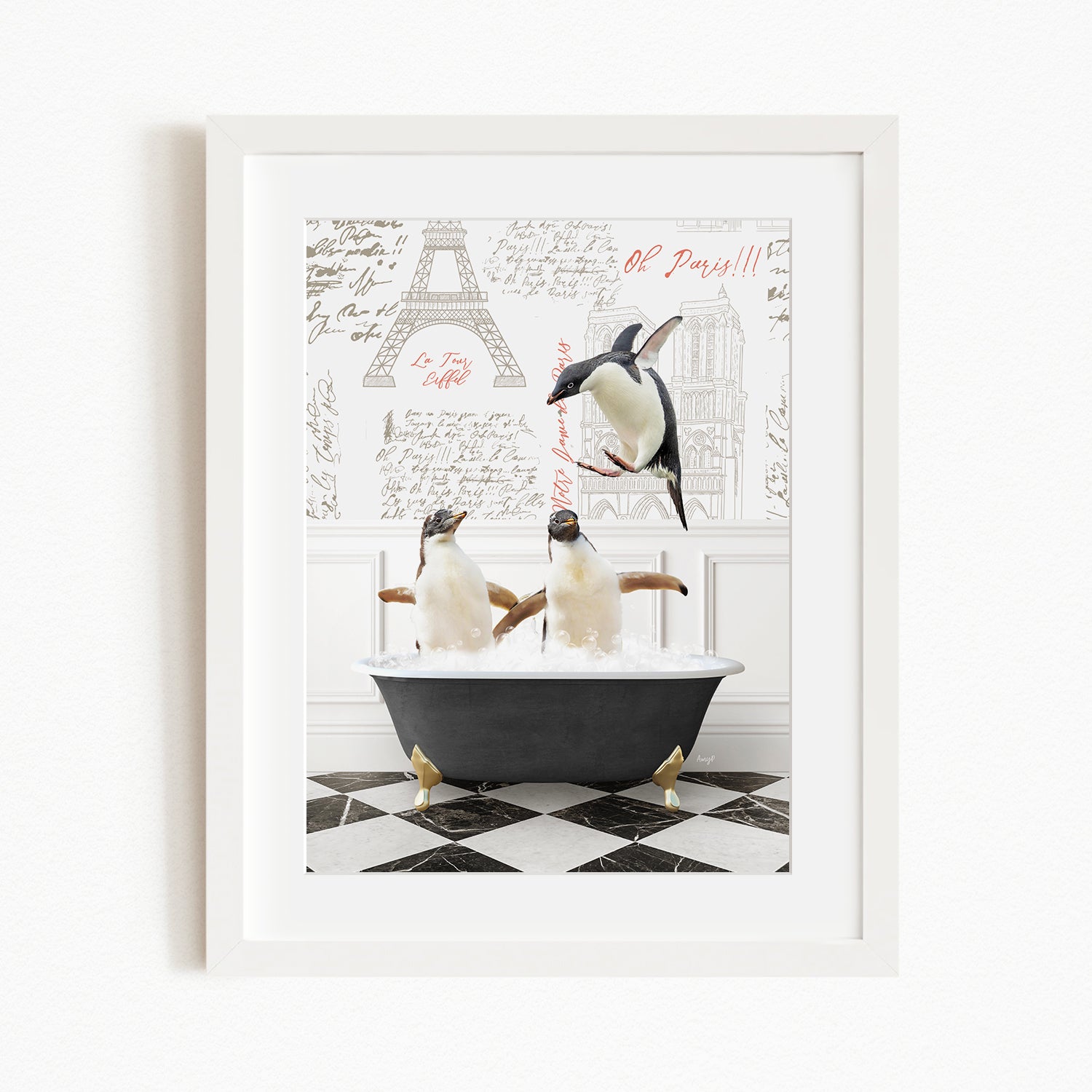A framed image depicting three penguins sitting in a bathtub, with one penguin flying above the tub and another penguin sitting in the tub. The background features a wall with text and drawings, including the Eiffel Tower.