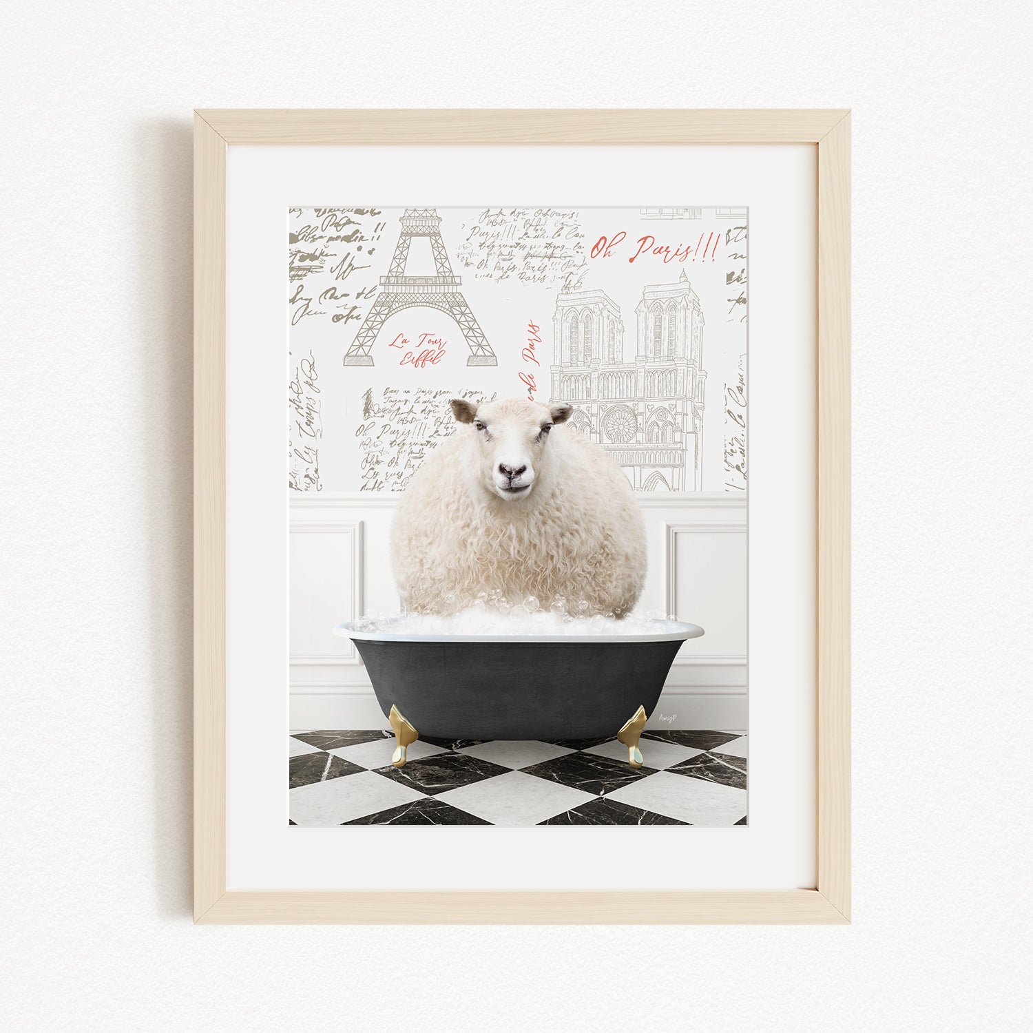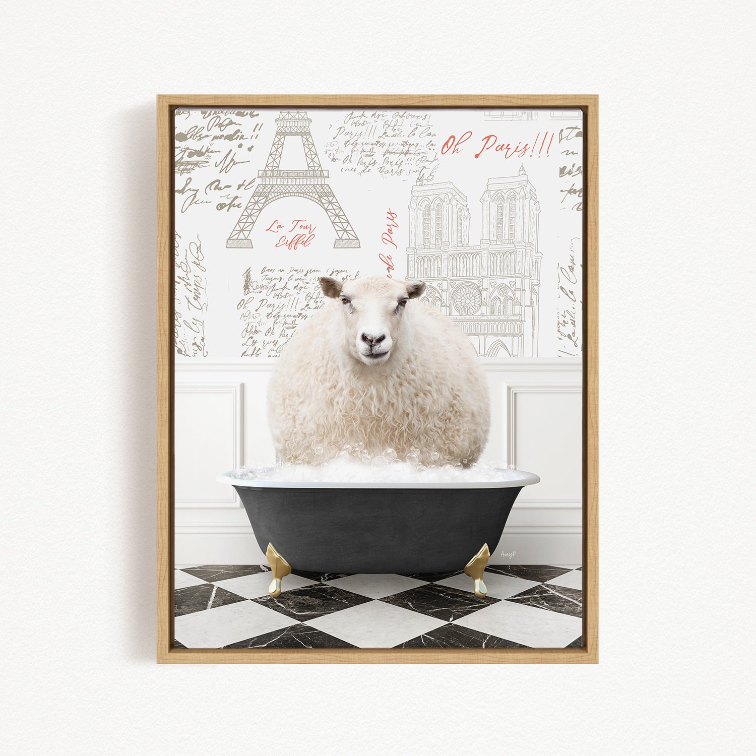 A framed image depicting a fluffy white sheep sitting in a black bathtub, with a Paris-themed background featuring the Eiffel Tower and other Parisian landmarks.