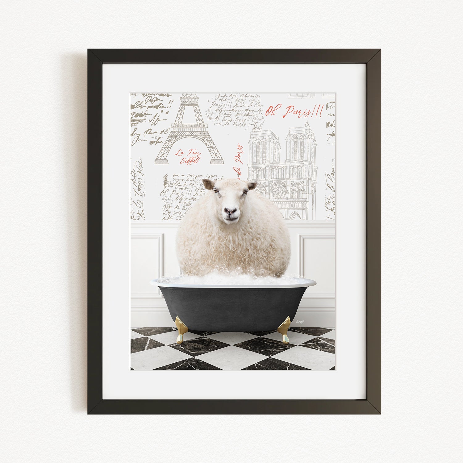 A fluffy white sheep sits in a black bathtub, surrounded by a checkered black and white floor and a wall with a drawing of the Eiffel Tower.