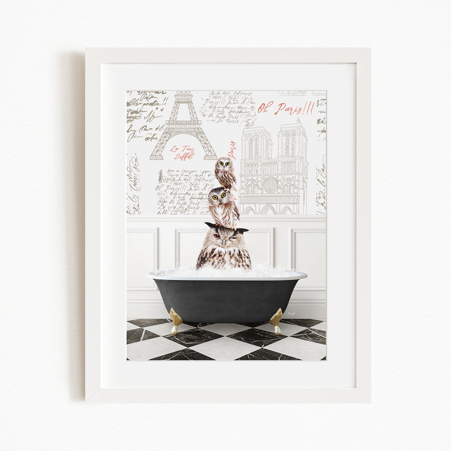 A framed image depicting three owls sitting in a bathtub, with a backdrop of the Eiffel Tower and other Parisian landmarks.